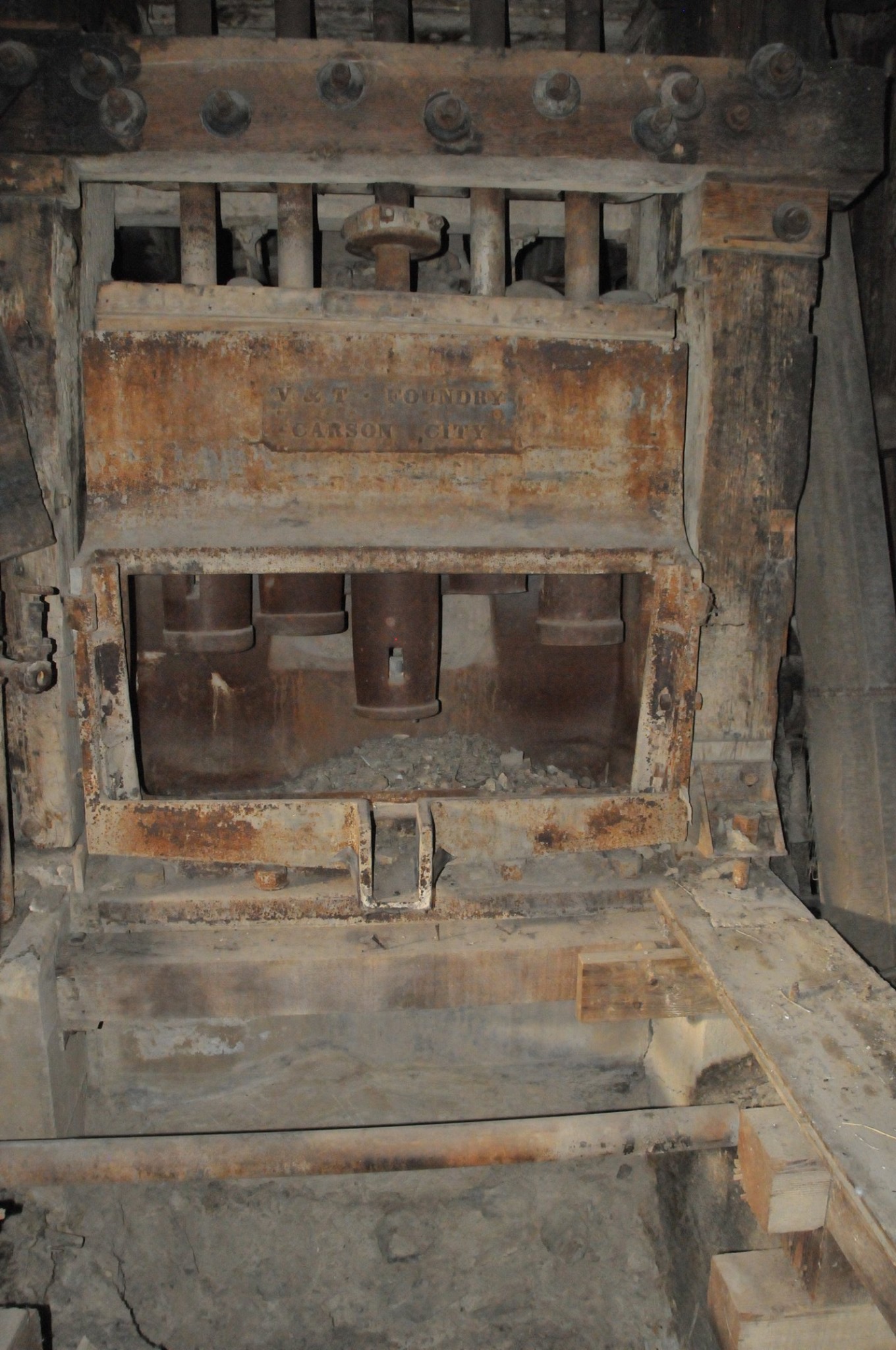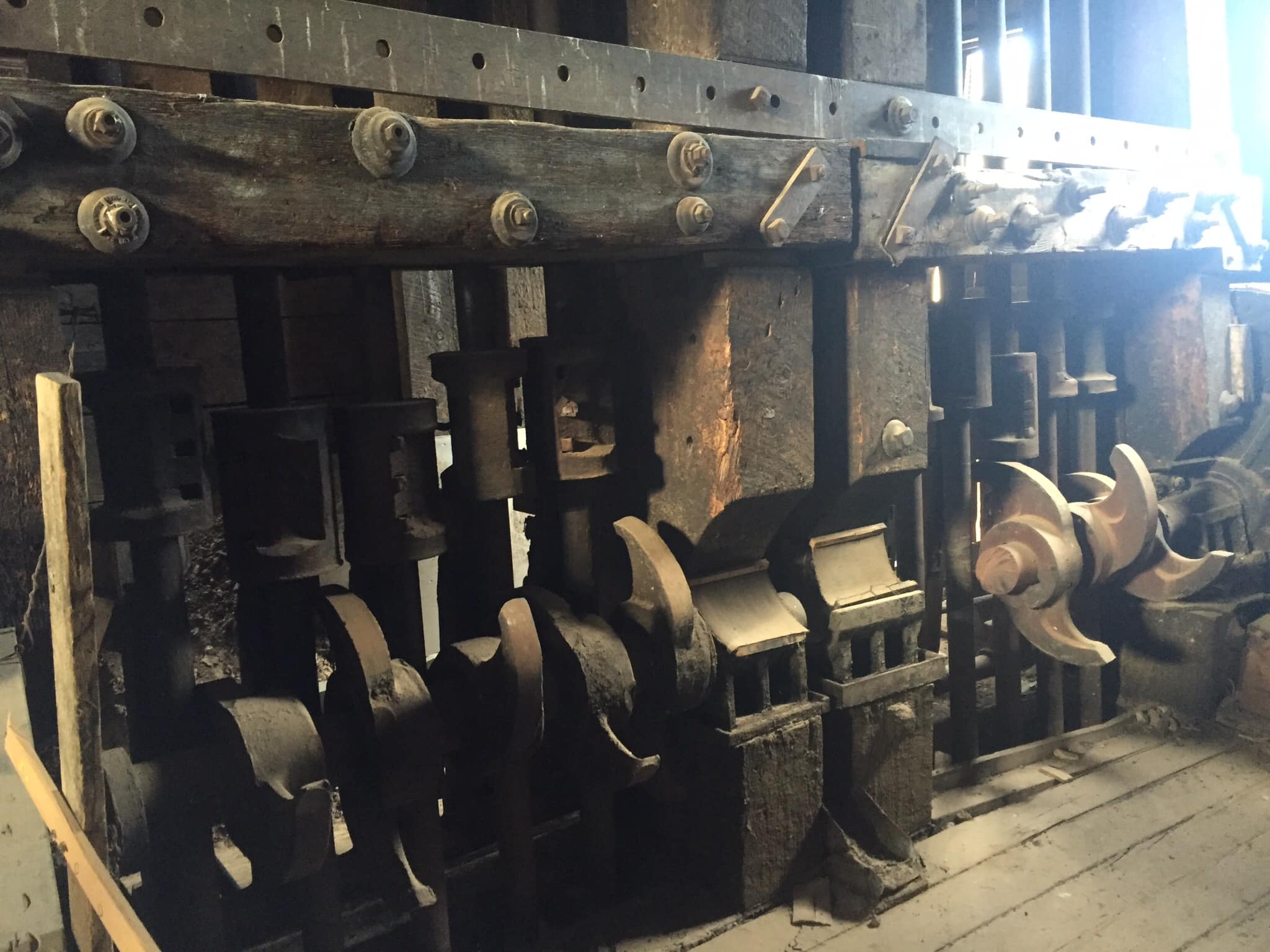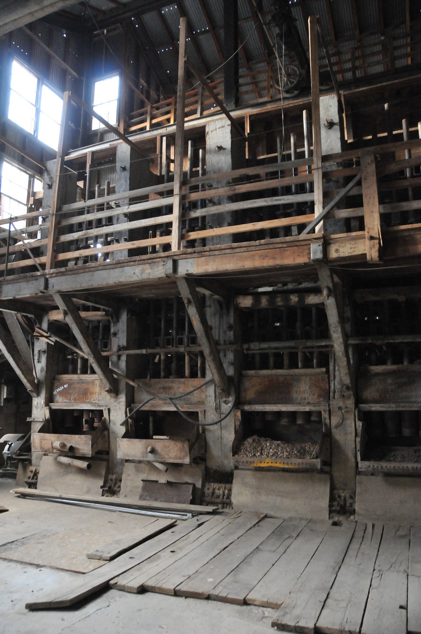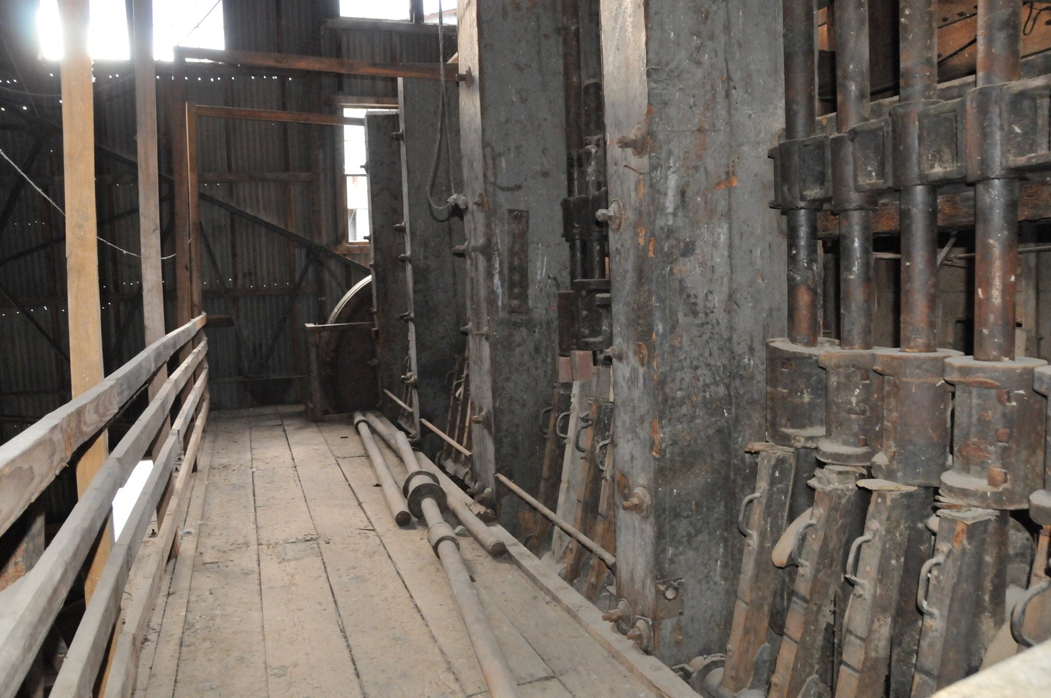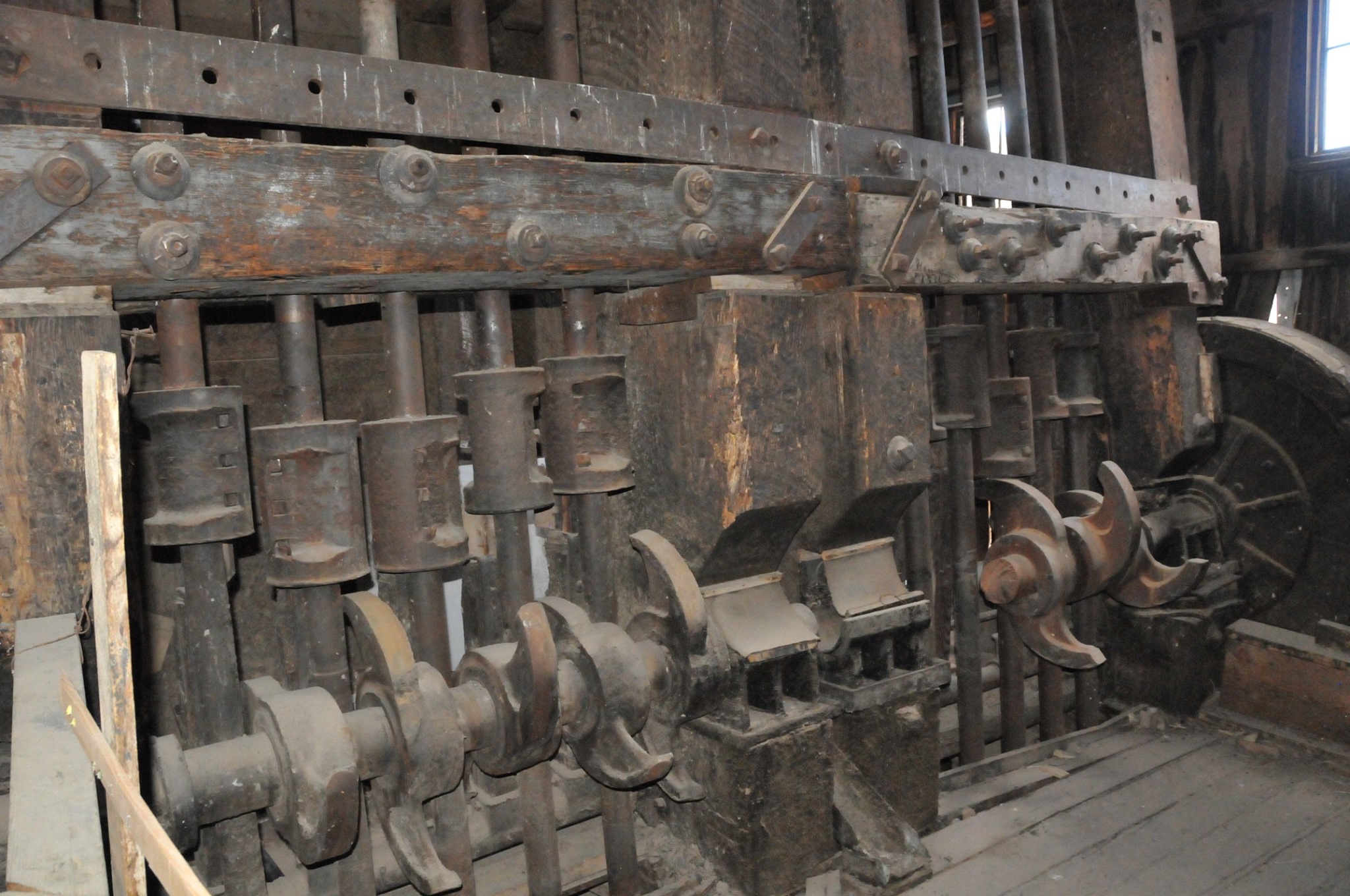 Batteries of 5 stamps. There are 6 batteries. They are preparing for one of the batteries to be operational for tours. Notice that the entire battery has the timber hold up pushed in to hold the stamps in the up position to allow for cleaning of the stamp box and cleaning and checking the stamp shoe and anvil to see it it needs replacing as the stamp spins as it goes up and down crushing the ore and it wears out. Those parts are easily replaced.