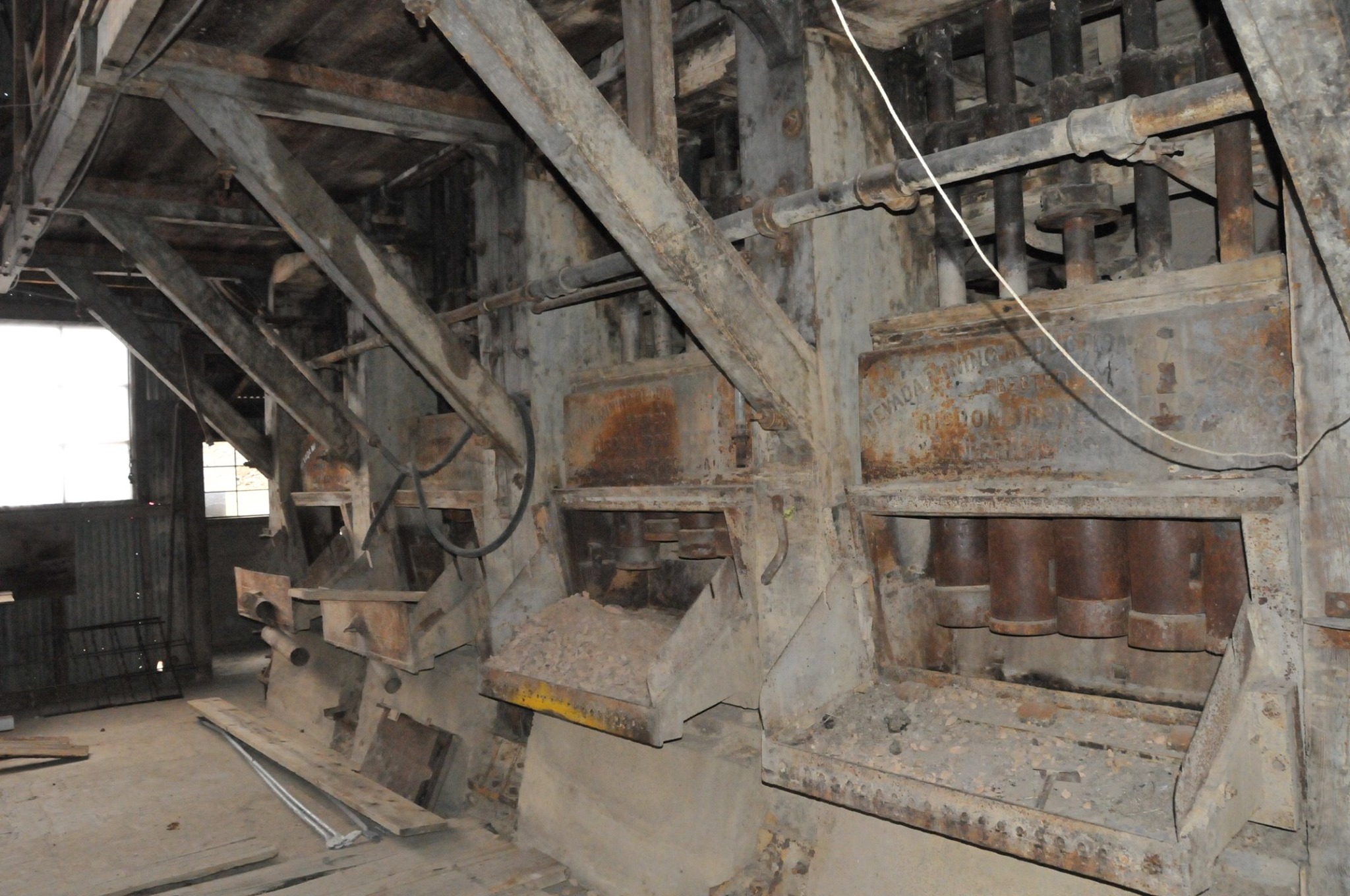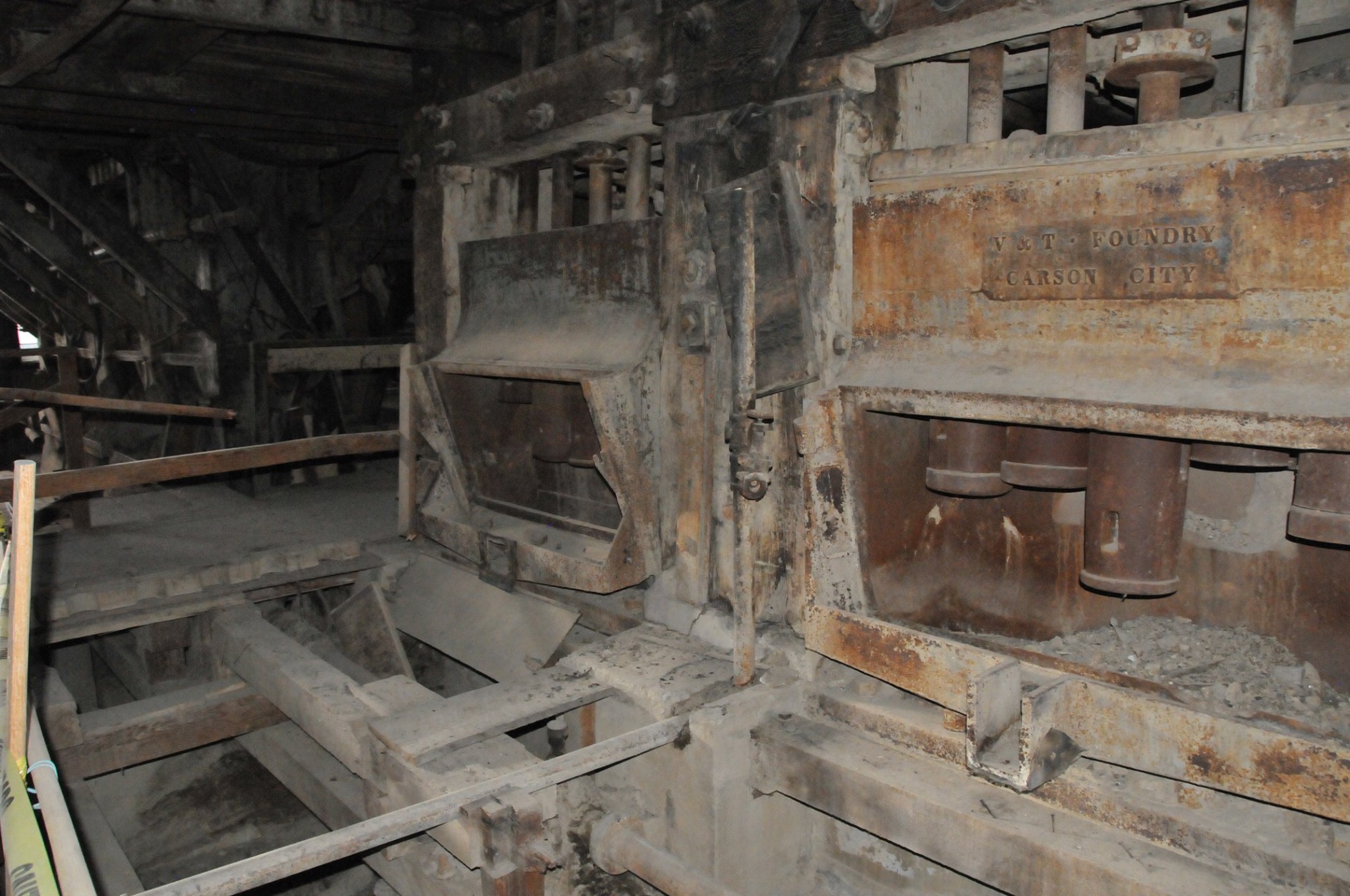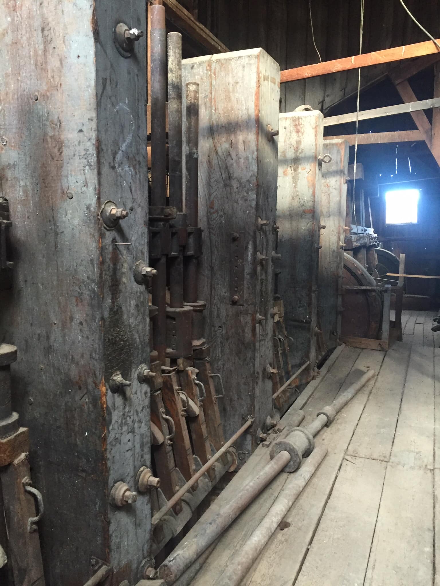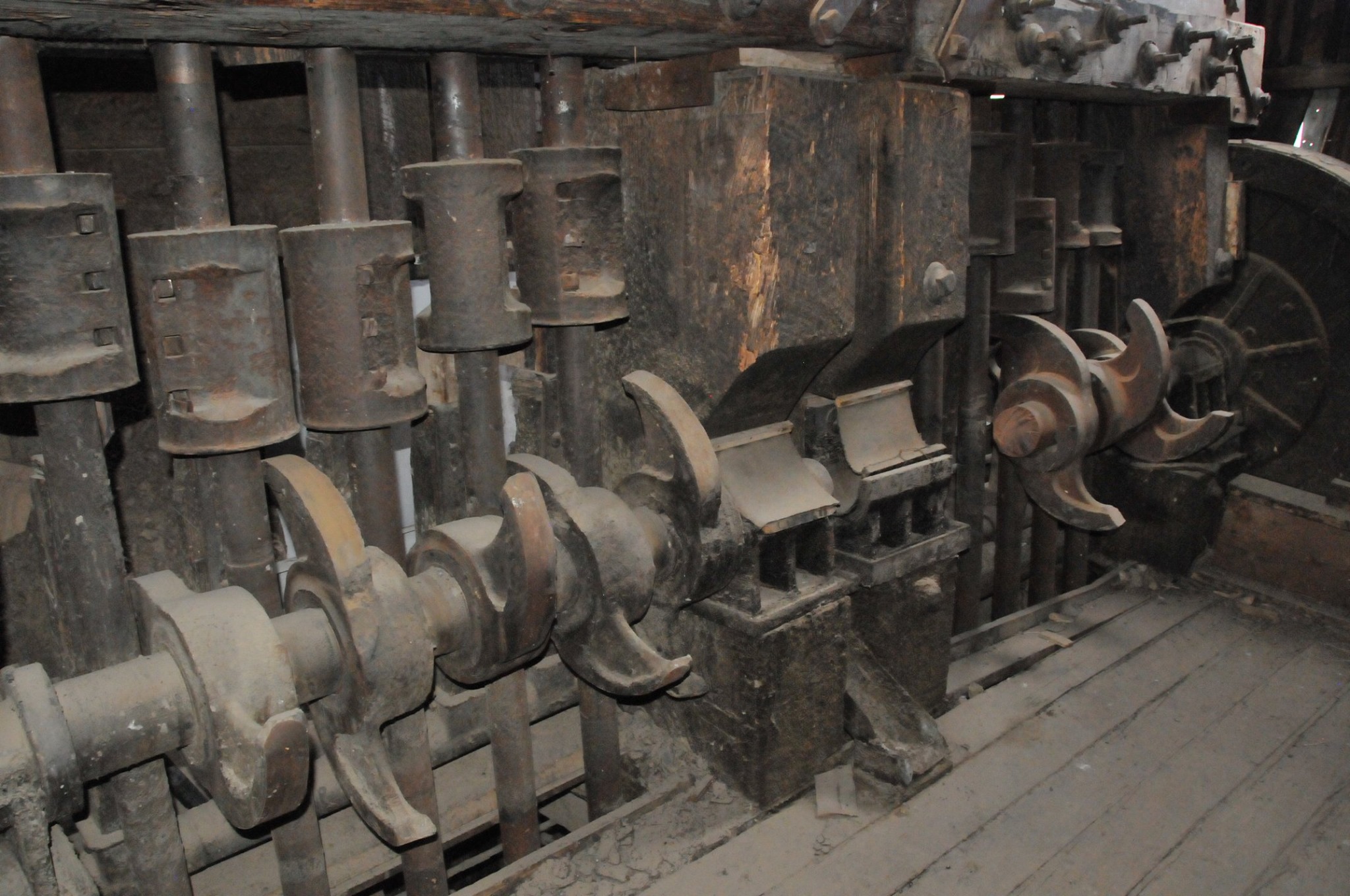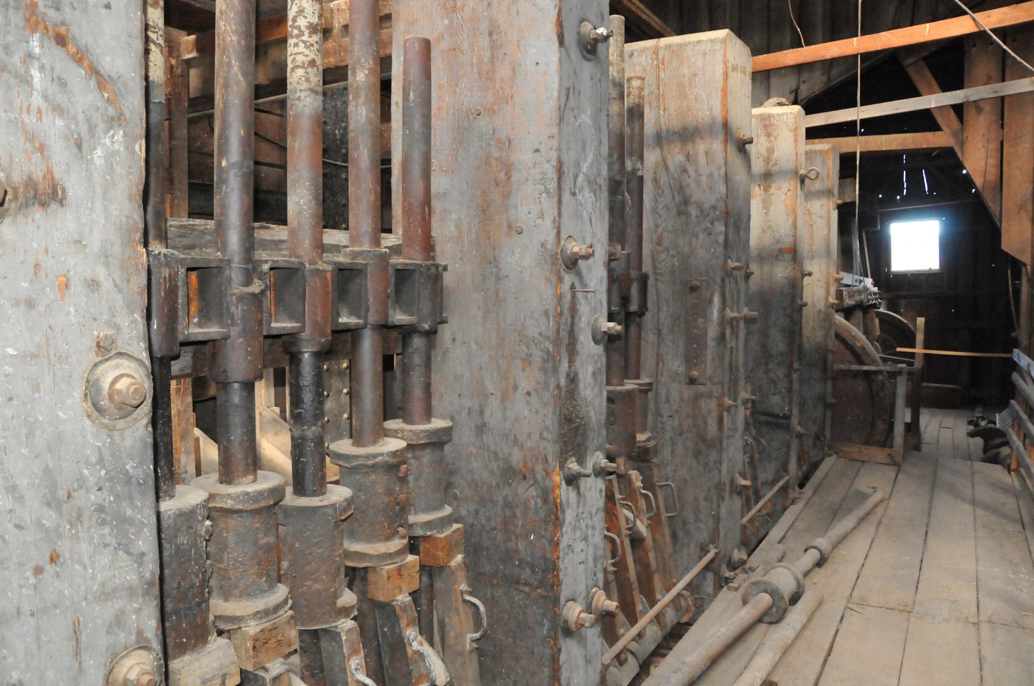 Batteries of 5 stamps. There are 6 batteries. They are preparing for one of the batteries to be operational for tours. Notice that the entire battery has the timber hold up pushed in to hold the stamps in the up position to allow for cleaning of the stamp box and cleaning and checking the stamp shoe and anvil to see it it needs replacing as the stamp spins as it goes up and down crushing the ore and it wears out. Those parts are easily replaced.