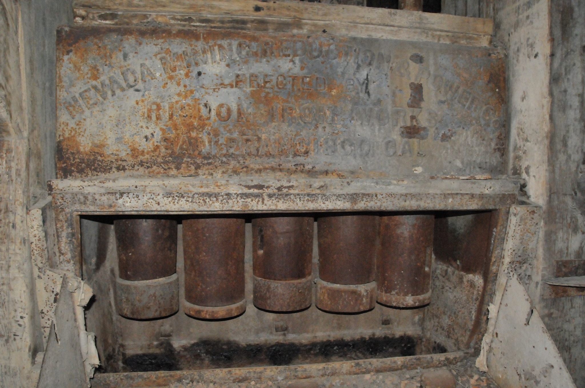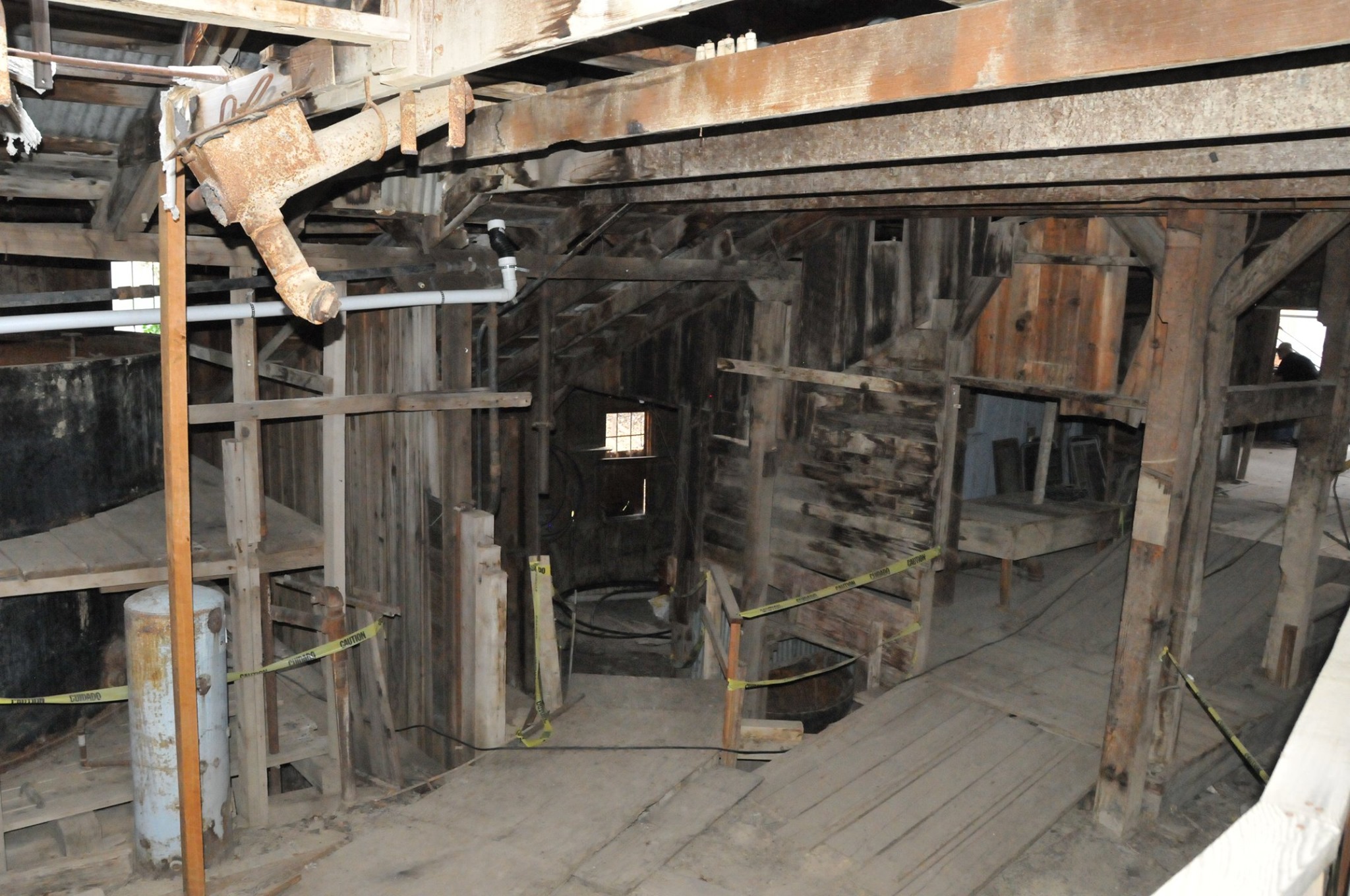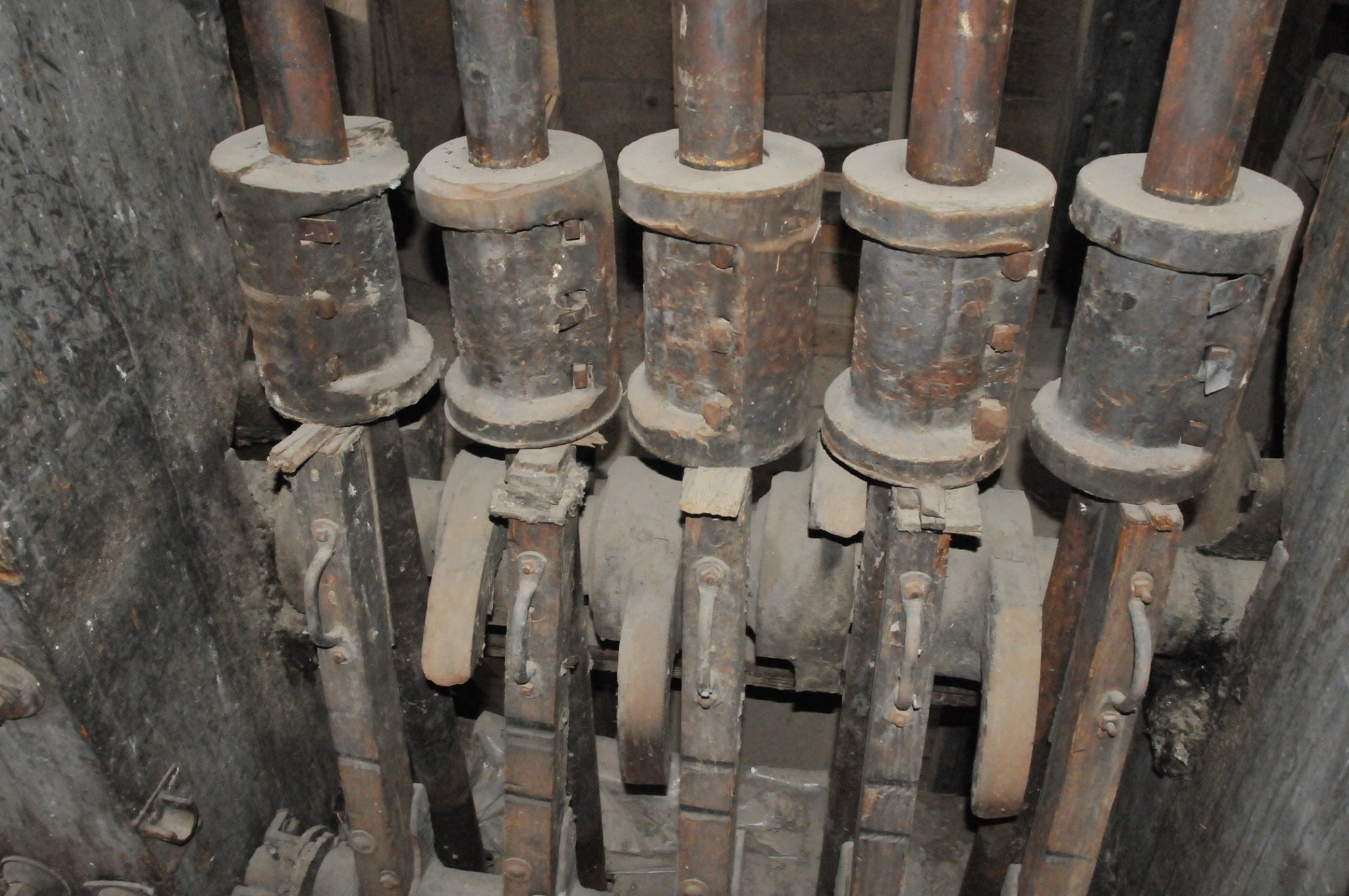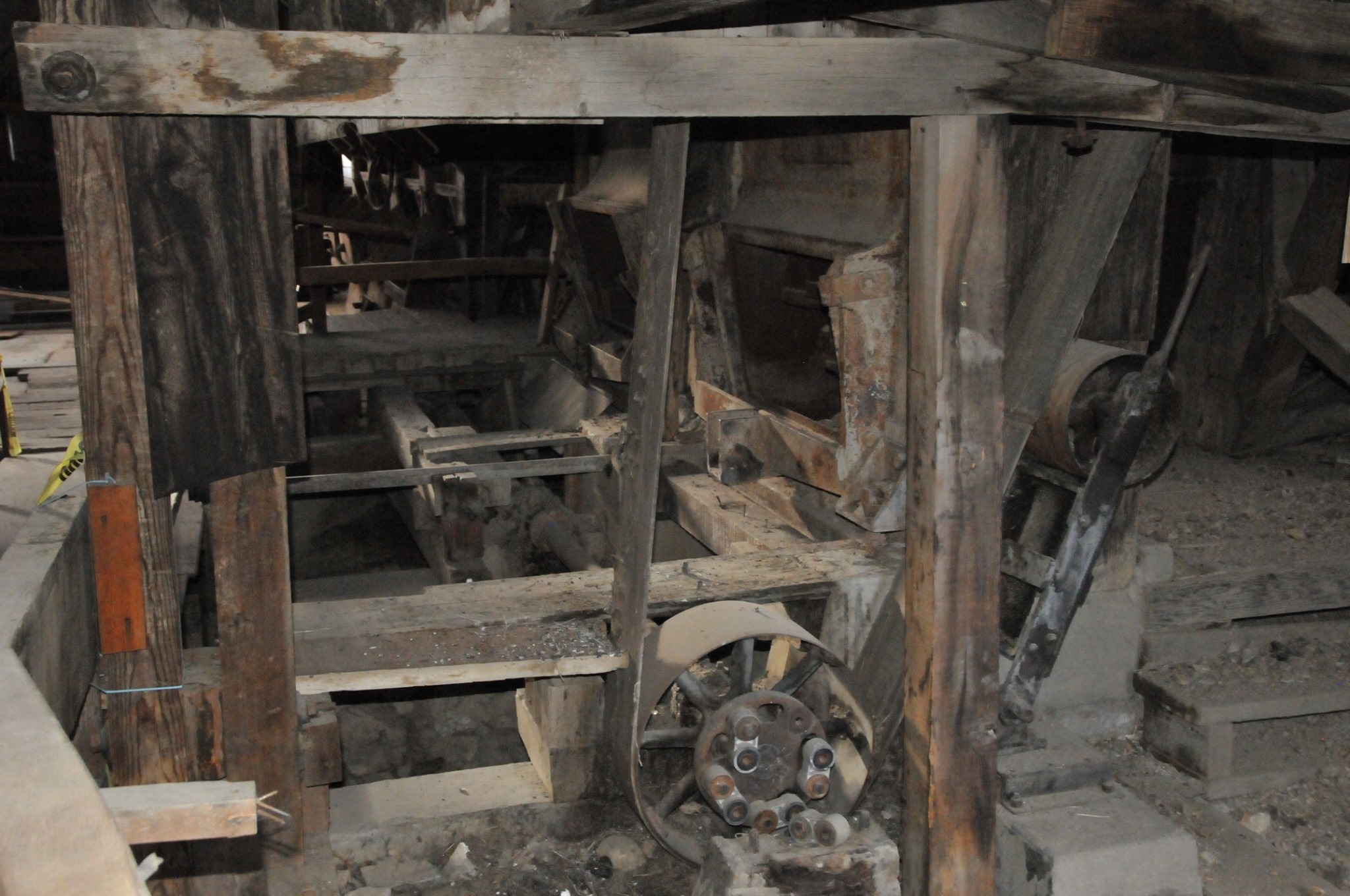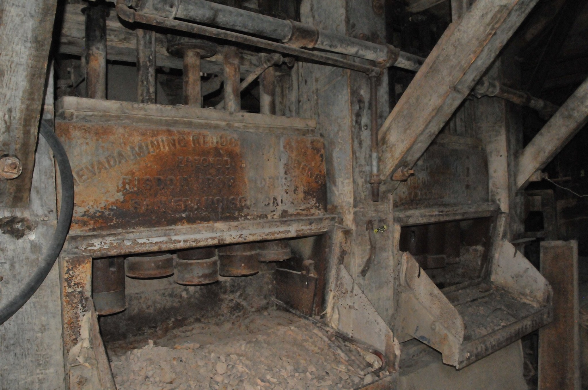 Batteries of 5 stamps. There are 6 batteries. They are preparing for one of the batteries to be operational for tours. Notice that the entire battery has the timber hold up pushed in to hold the stamps in the up position to allow for cleaning of the stamp box and cleaning and checking the stamp shoe and anvil to see it it needs replacing as the stamp spins as it goes up and down crushing the ore and it wears out. Those parts are easily replaced.