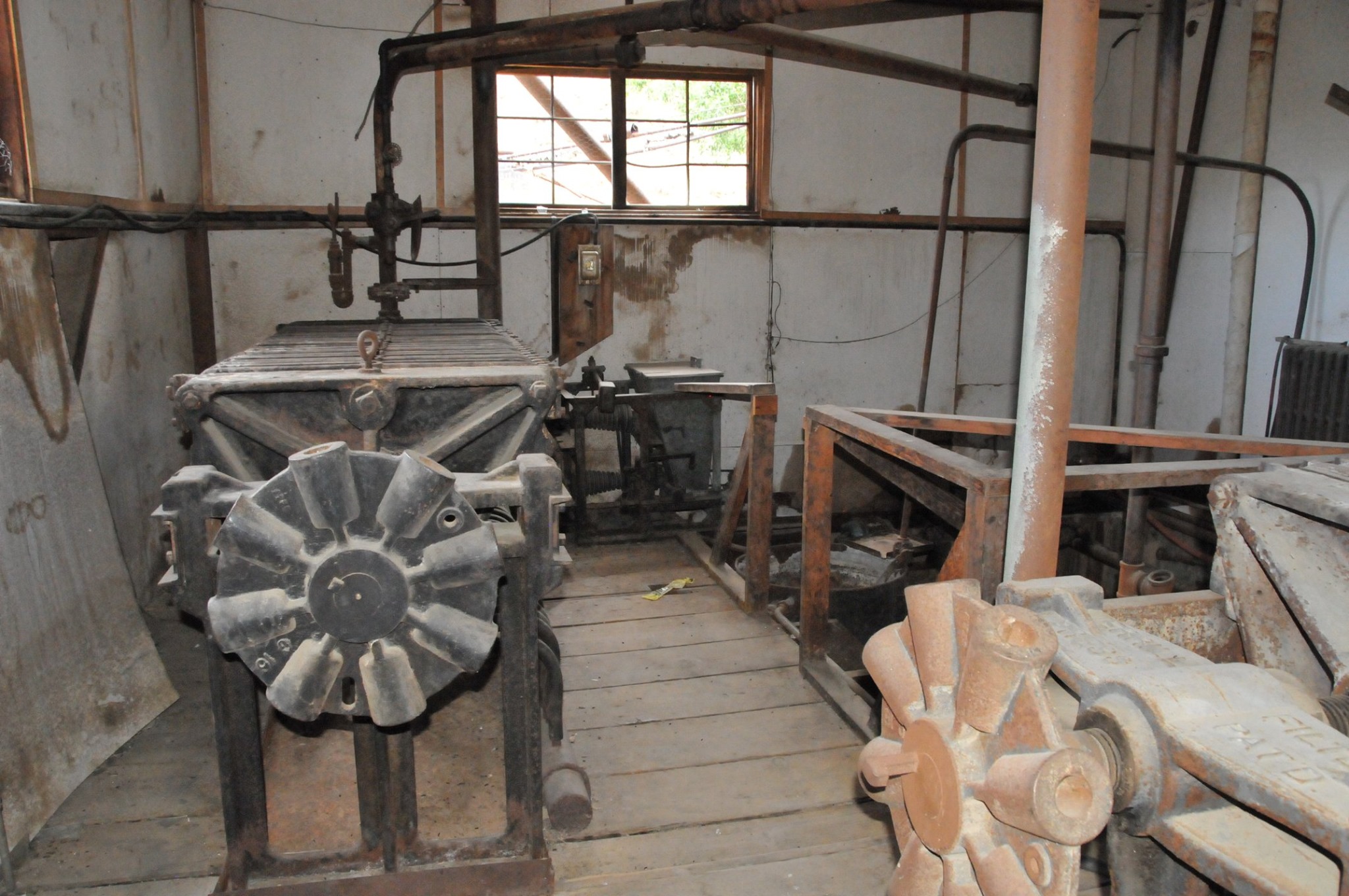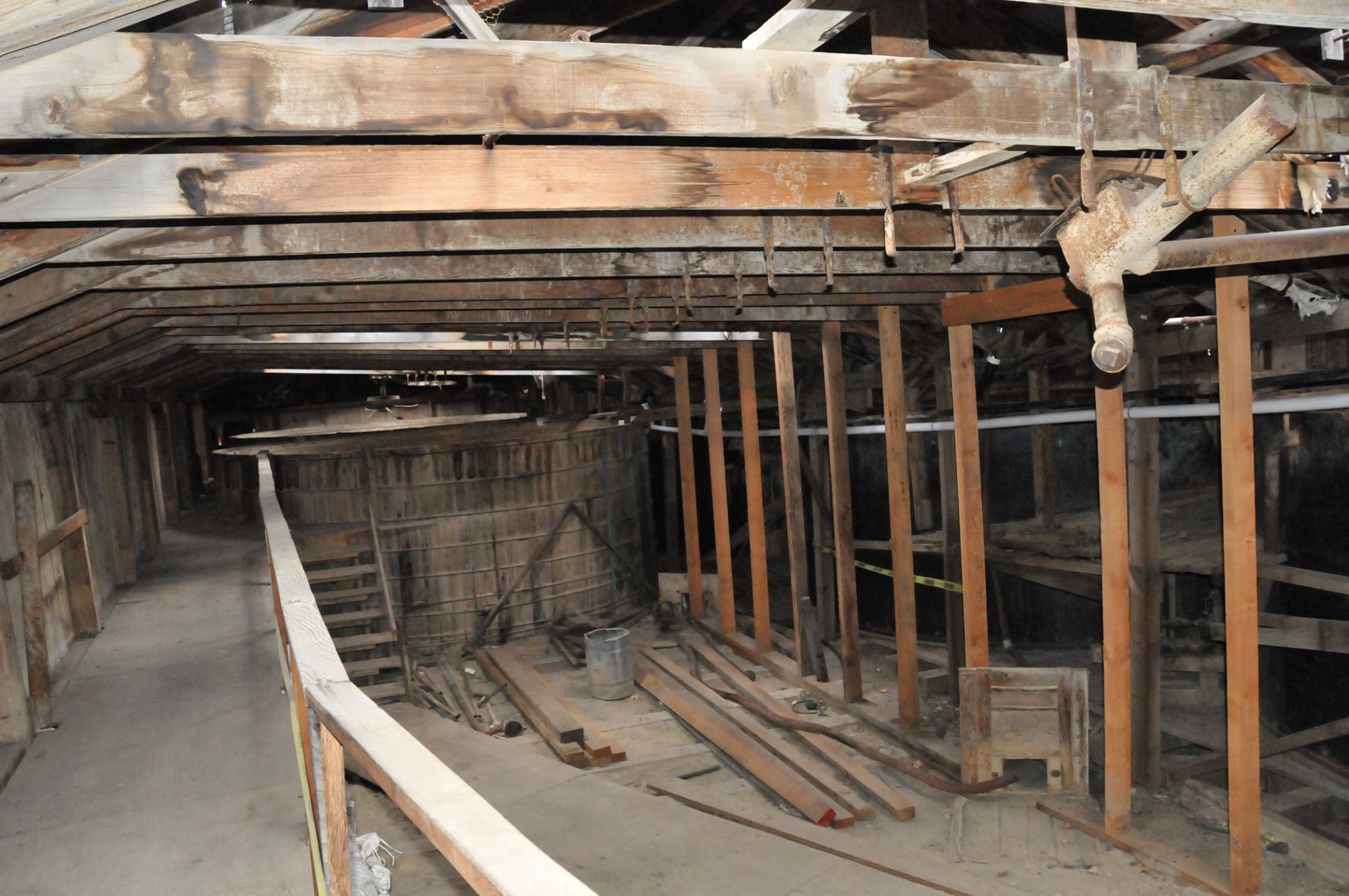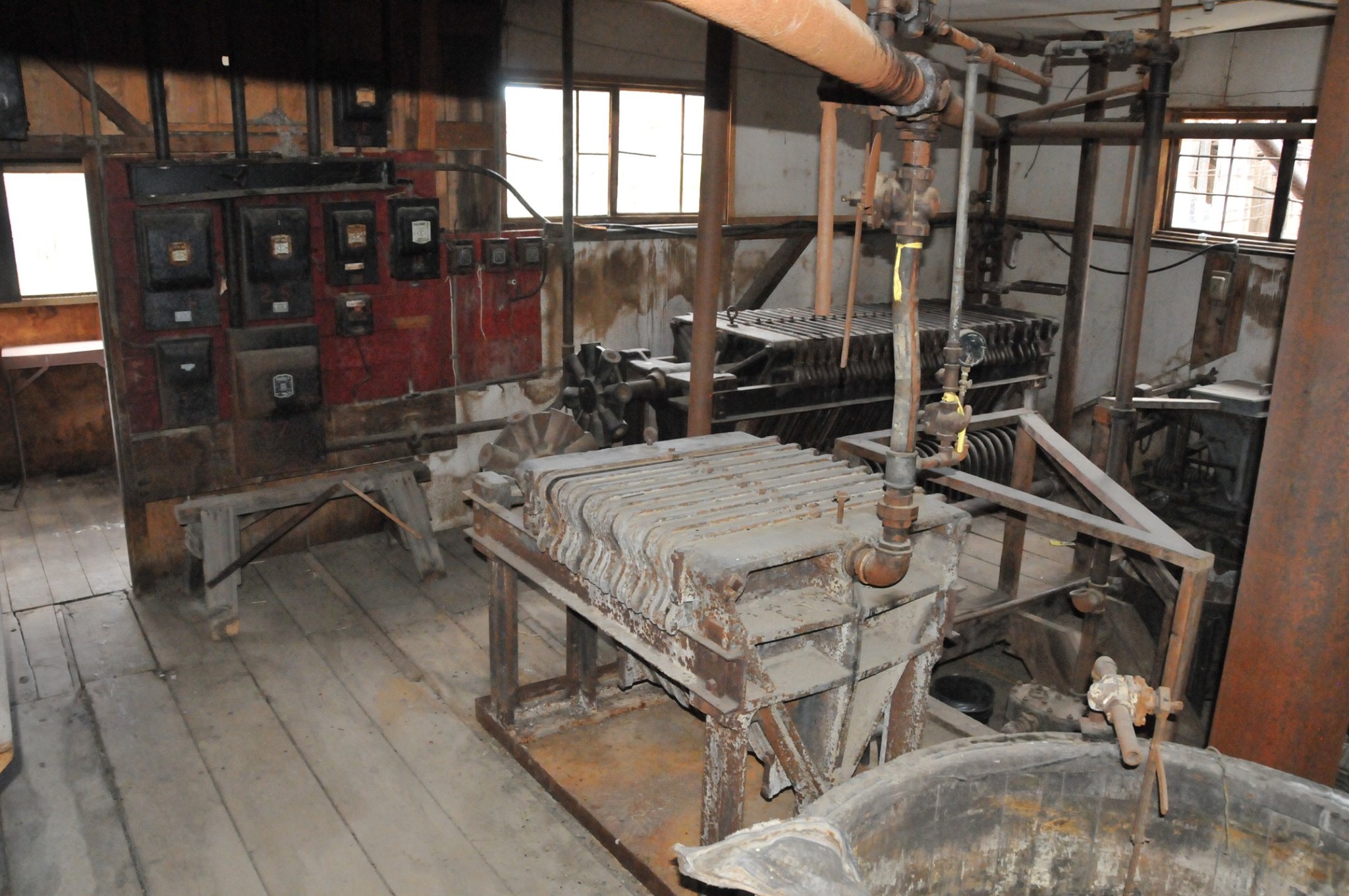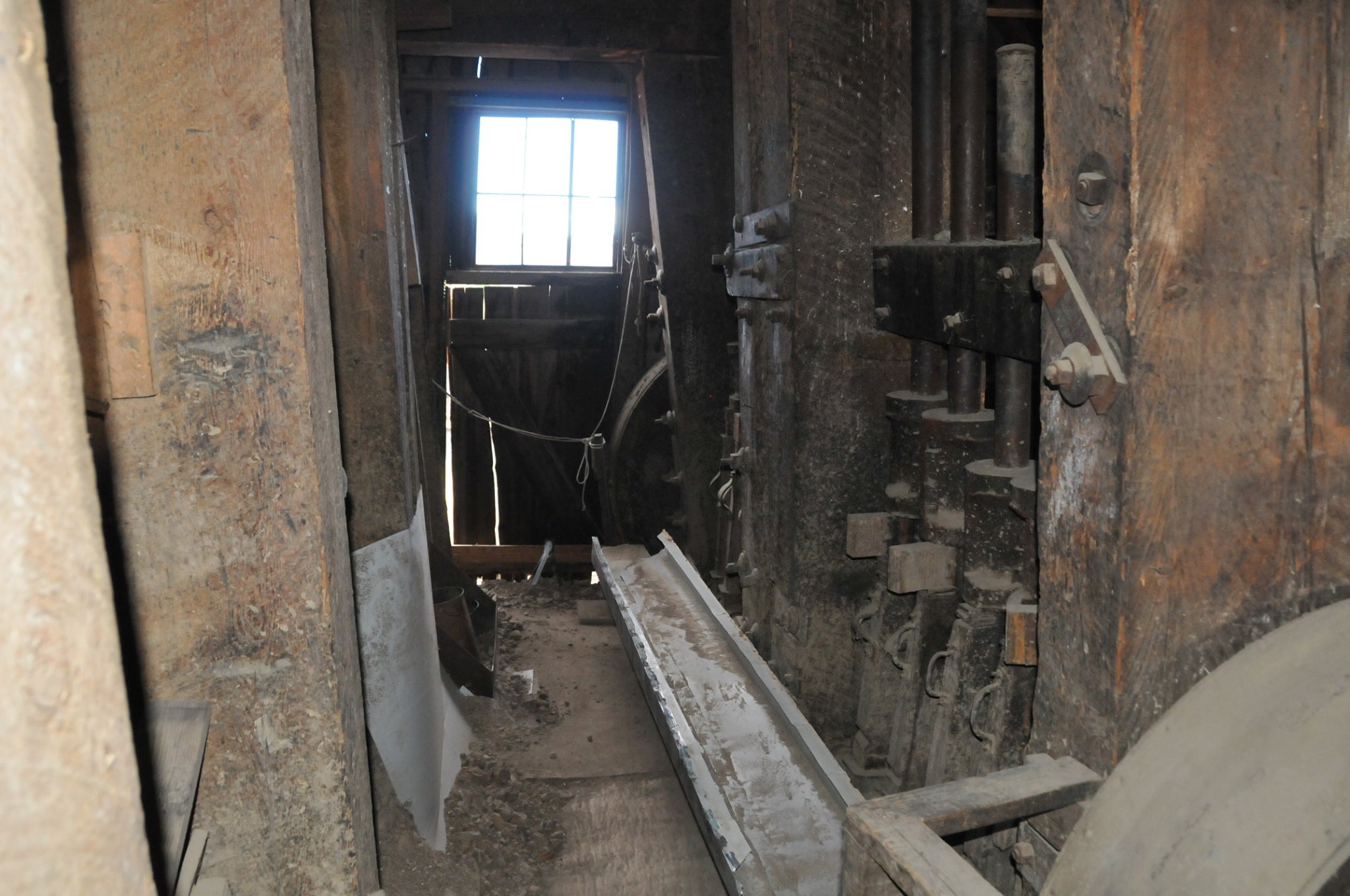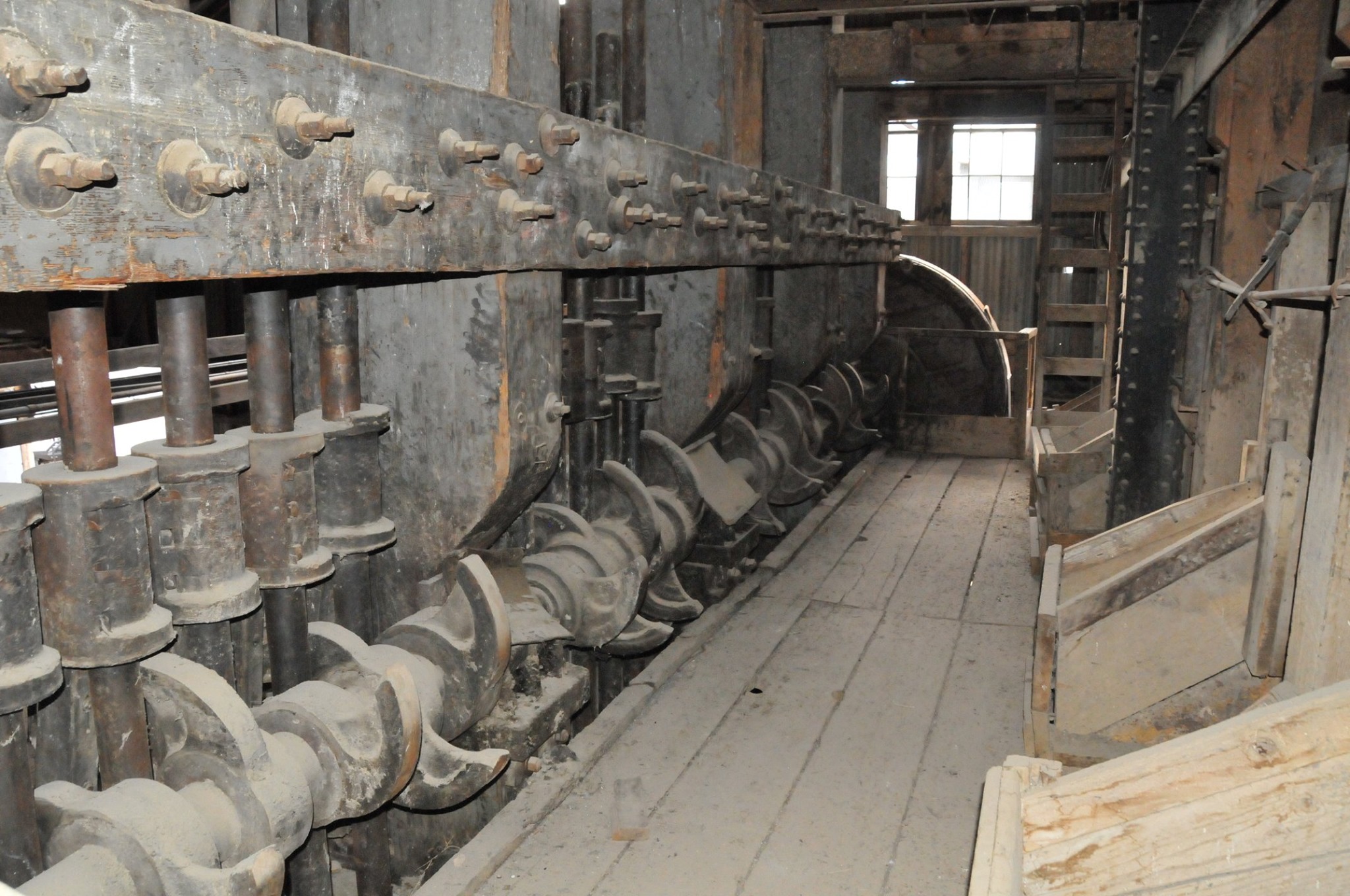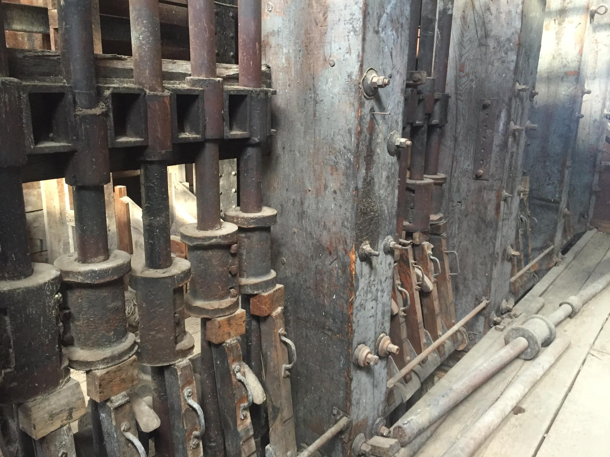 Batteries of 5 stamps. There are 6 batteries. They are preparing for one of the batteries to be operational for tours. Notice that the entire battery has the timber hold up pushed in to hold the stamps in the up position to allow for cleaning of the stamp box and cleaning and checking the stamp shoe and anvil to see it it needs replacing as the stamp spins as it goes up and down crushing the ore and it wears out. Those parts are easily replaced.