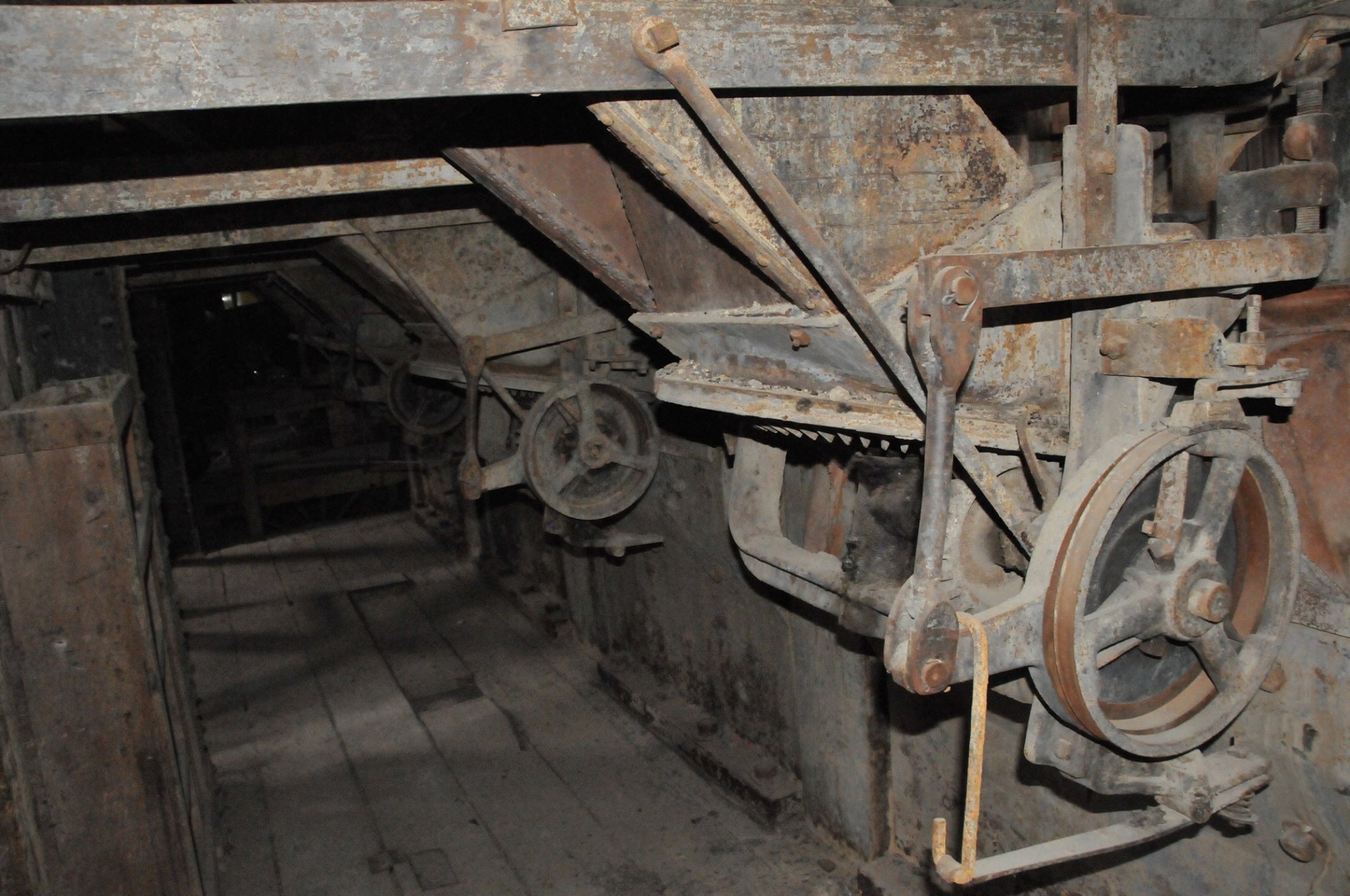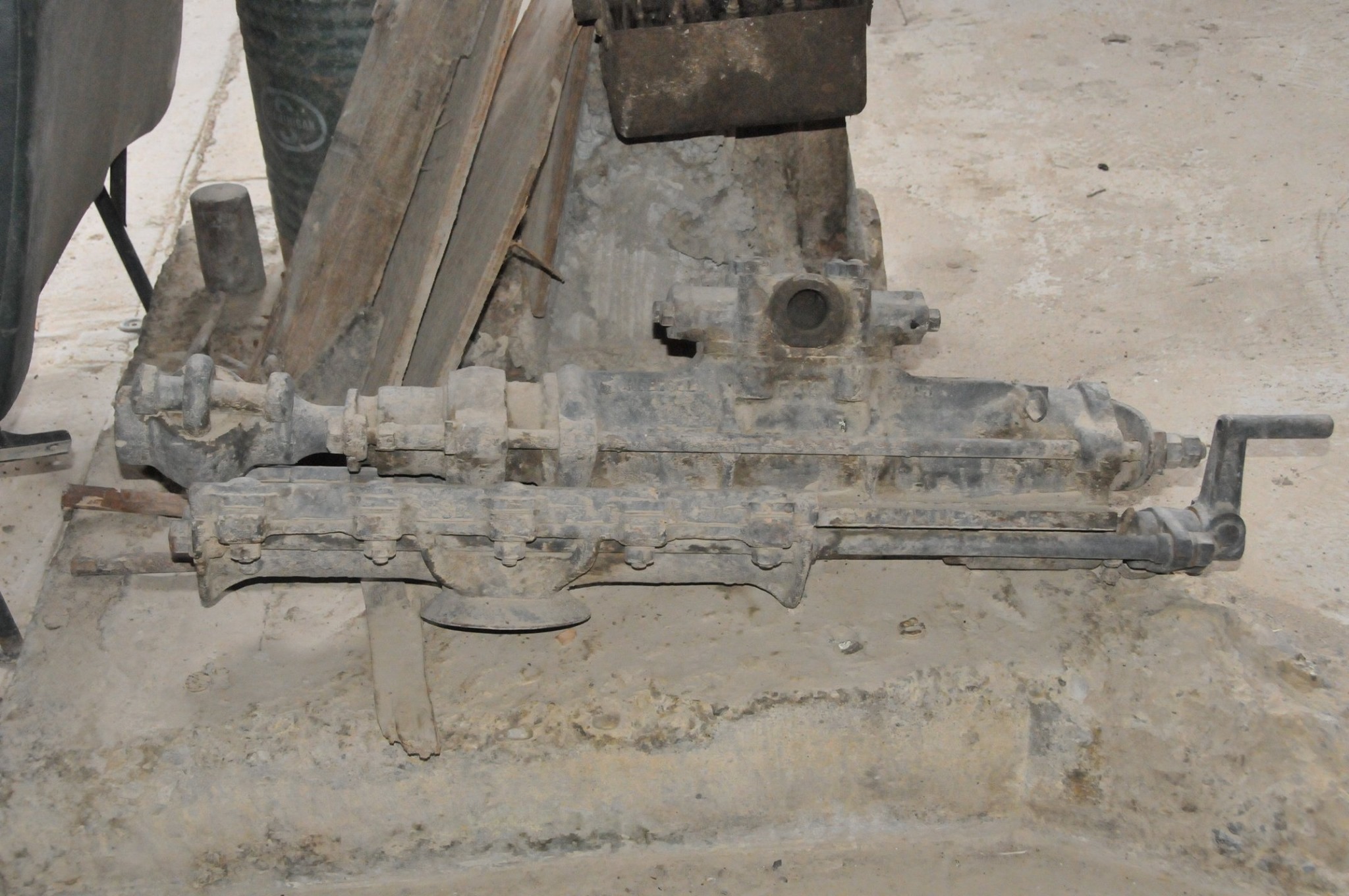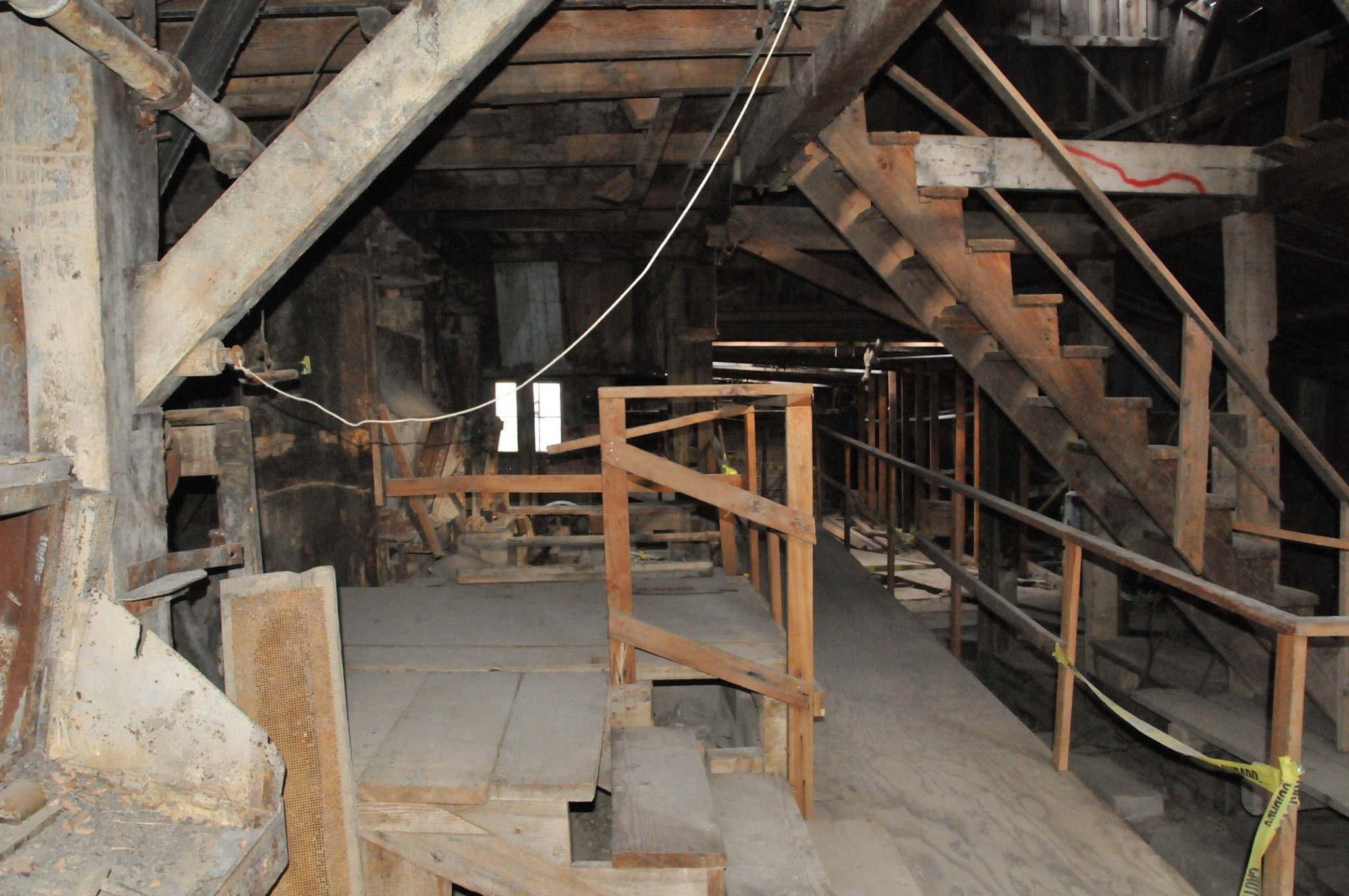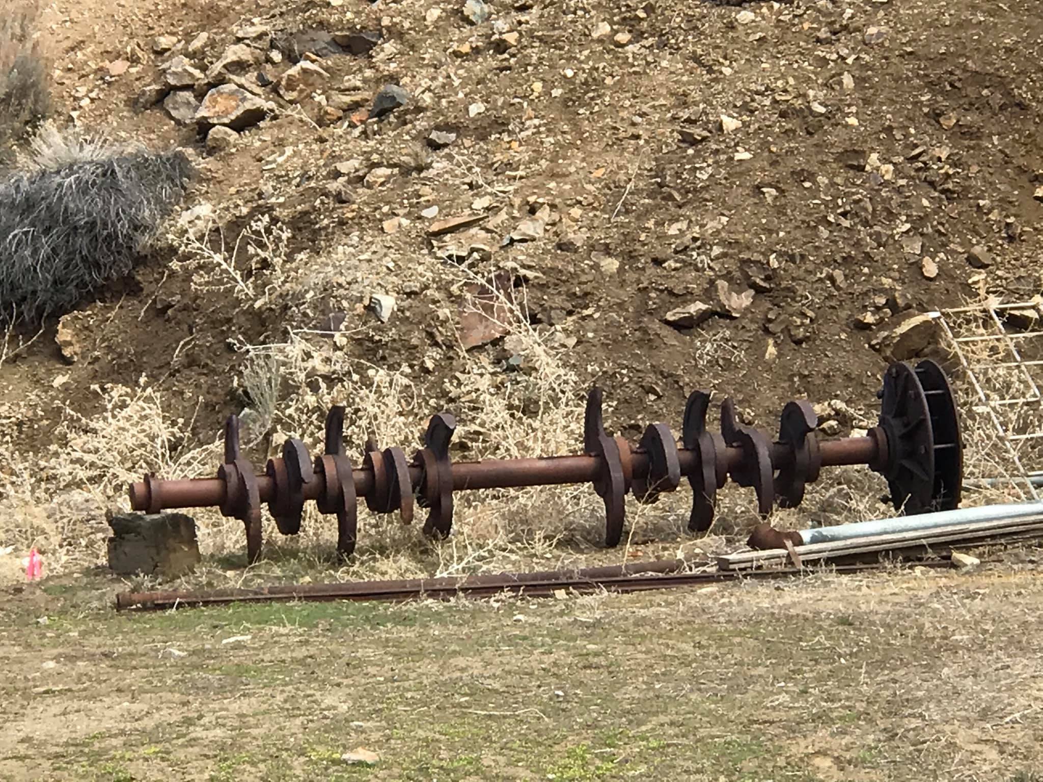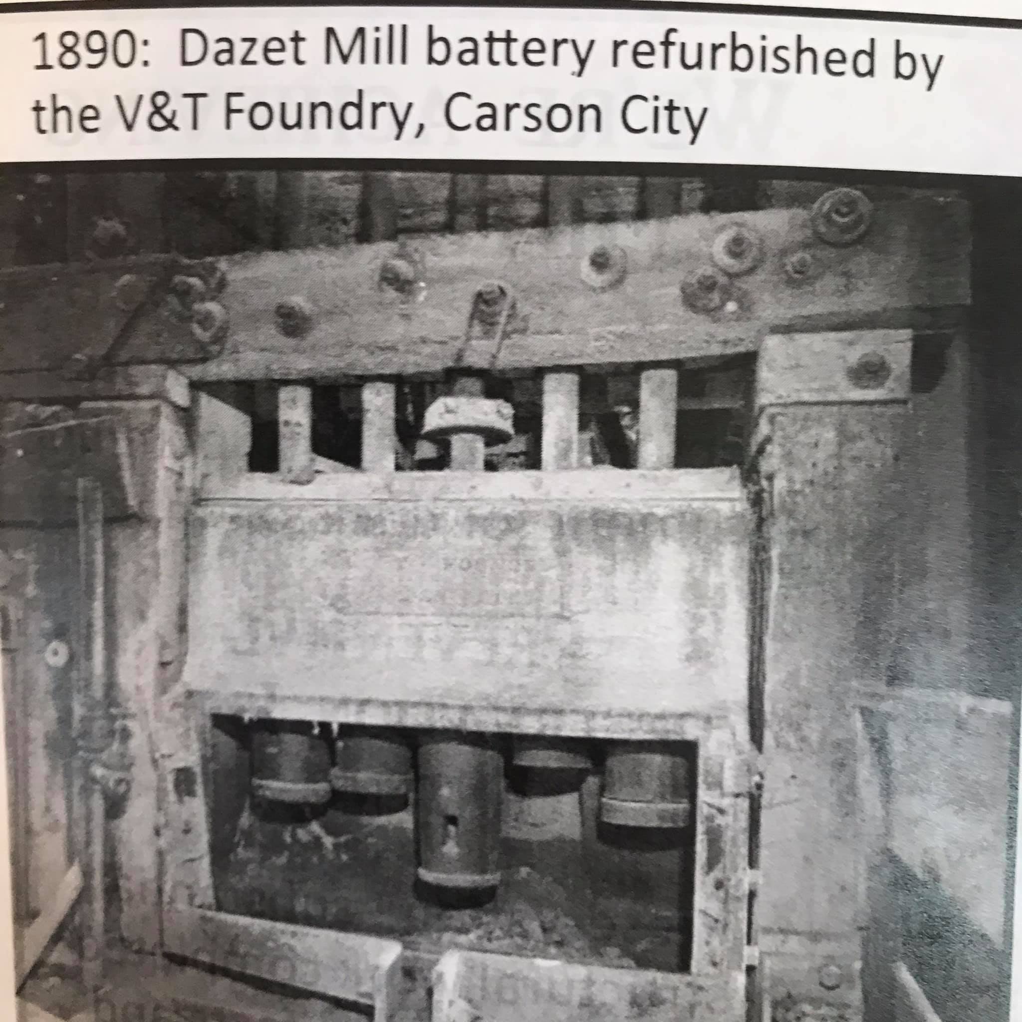 Batteries of 5 stamps. There are 6 batteries. They are preparing for one of the batteries to be operational for tours. Notice that the entire battery has the timber hold up pushed in to hold the stamps in the up position to allow for cleaning of the stamp box and cleaning and checking the stamp shoe and anvil to see it it needs replacing as the stamp spins as it goes up and down crushing the ore and it wears out. Those parts are easily replaced.