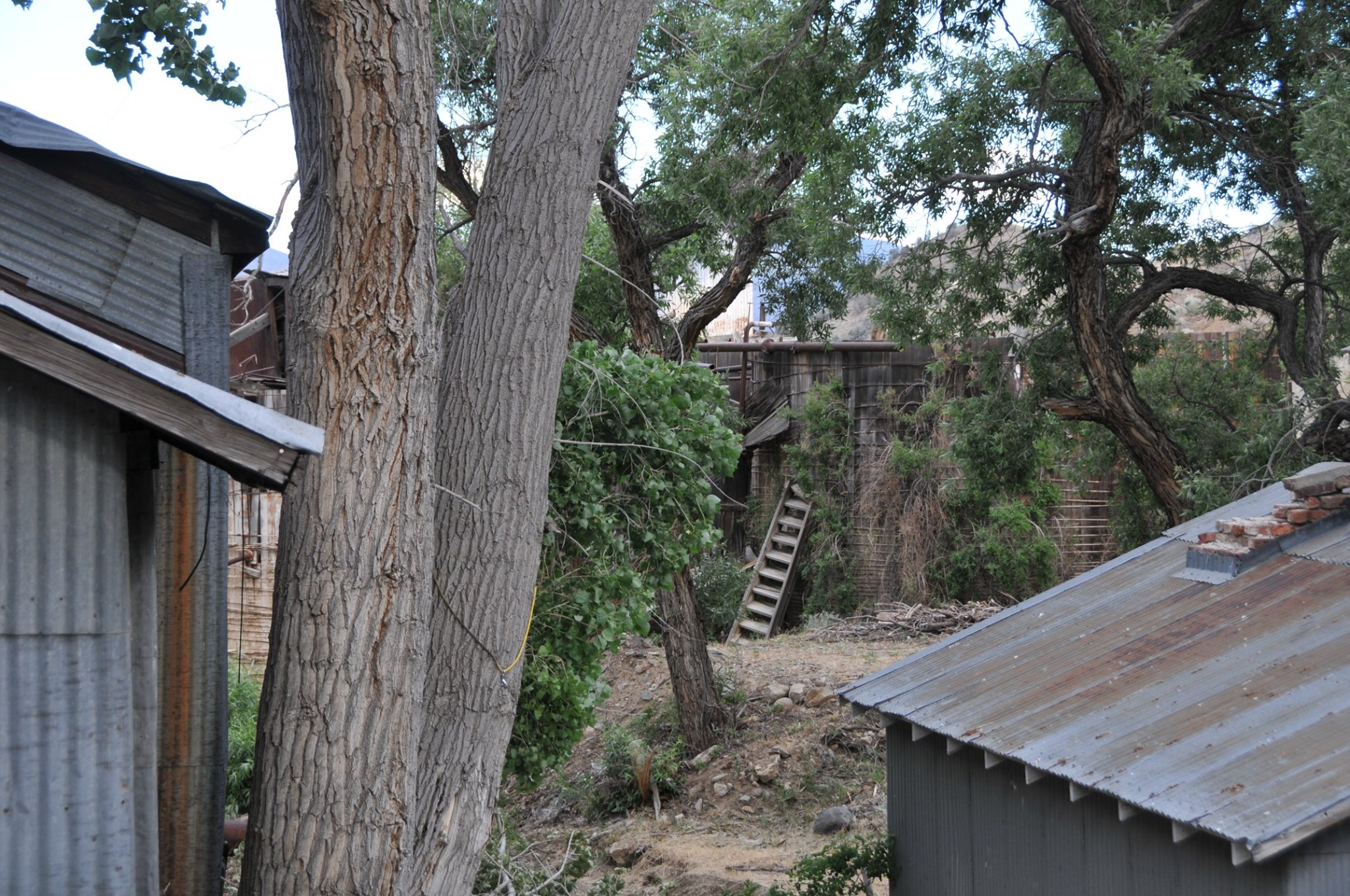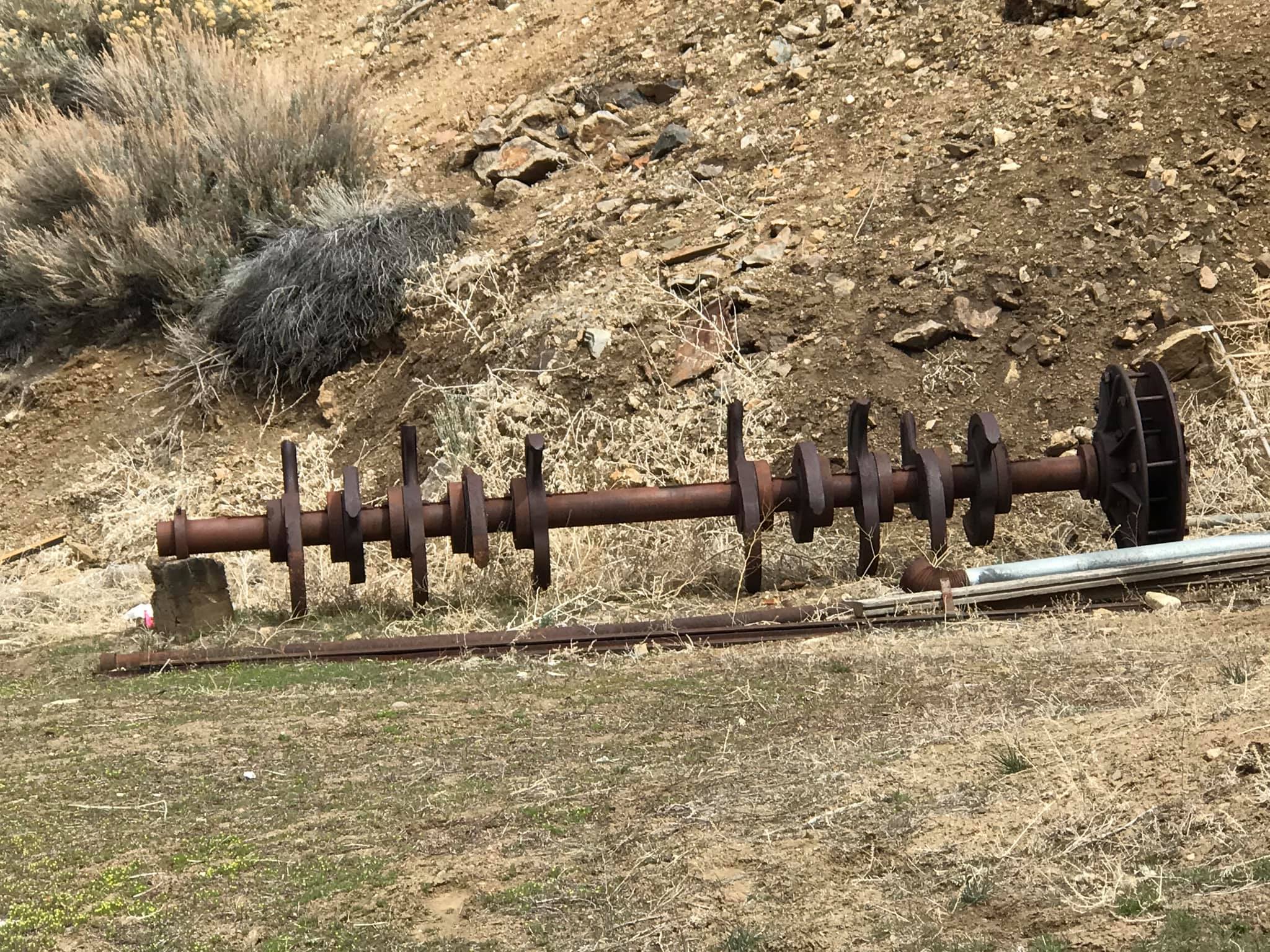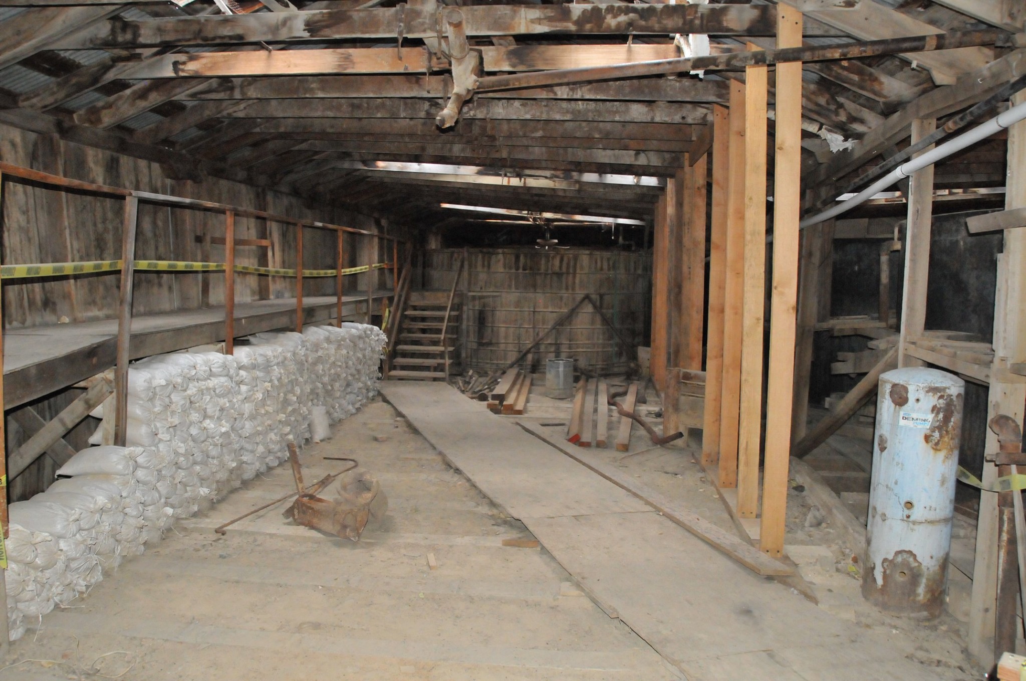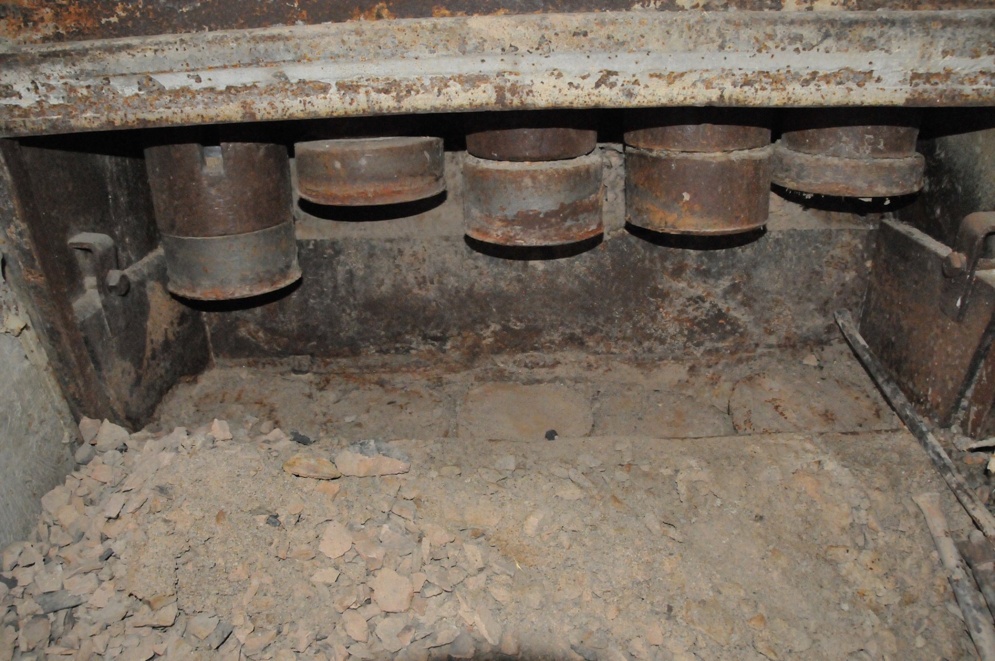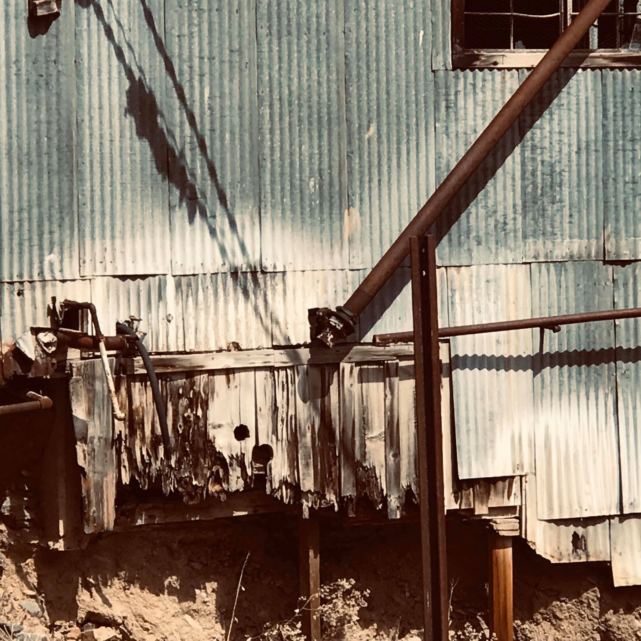 Batteries of 5 stamps. There are 6 batteries. They are preparing for one of the batteries to be operational for tours. Notice that the entire battery has the timber hold up pushed in to hold the stamps in the up position to allow for cleaning of the stamp box and cleaning and checking the stamp shoe and anvil to see it it needs replacing as the stamp spins as it goes up and down crushing the ore and it wears out. Those parts are easily replaced.