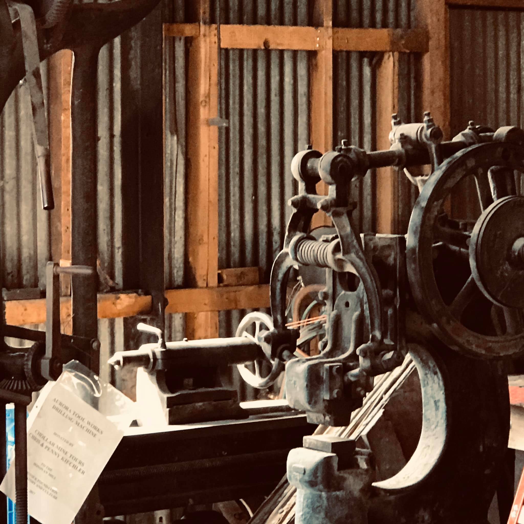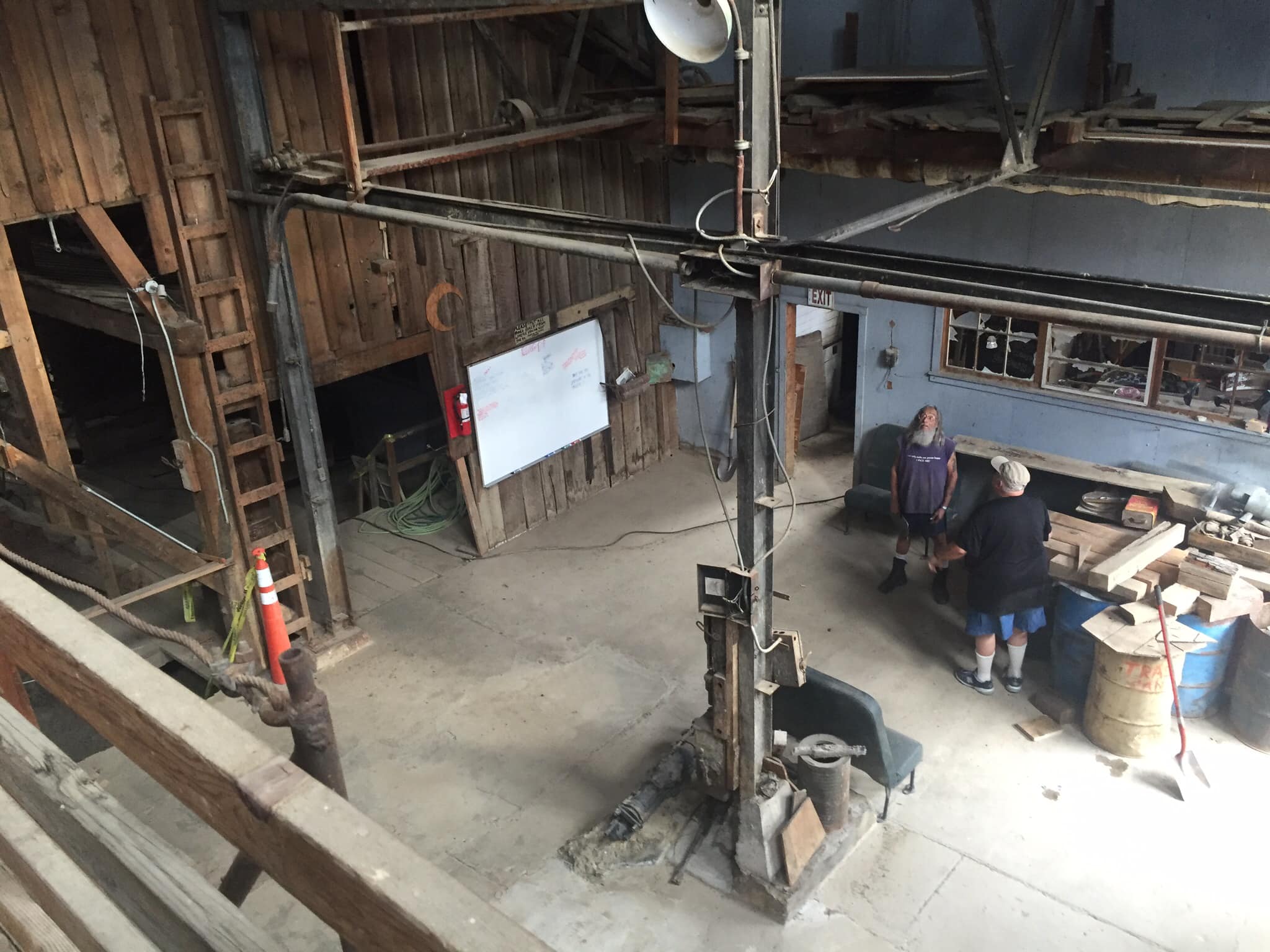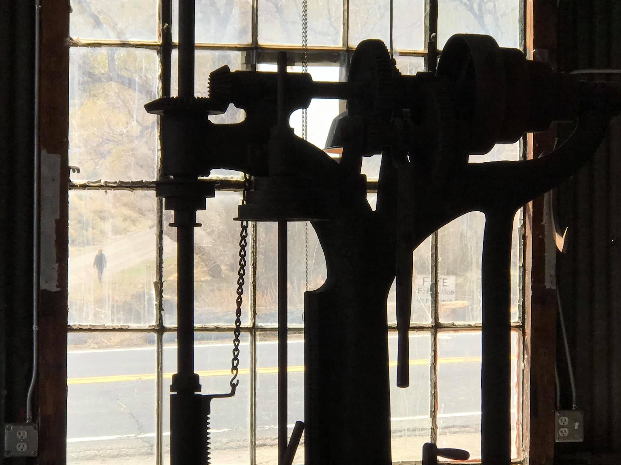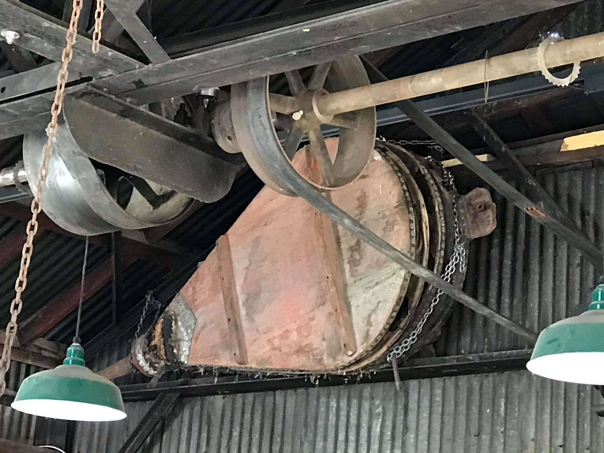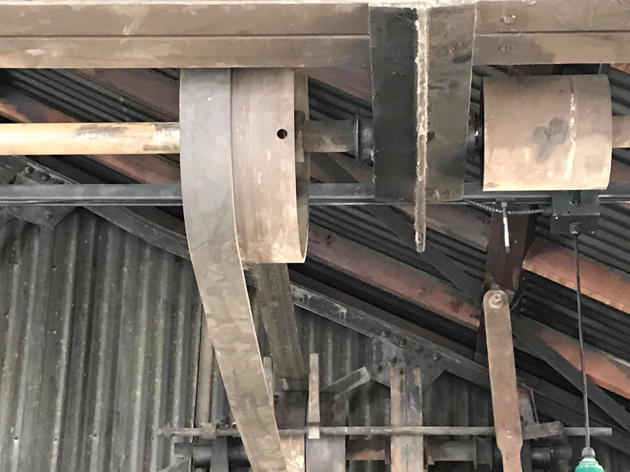 The blacksmith shop uses overhead belts to run all the machines driven by one power belt. The system is operational