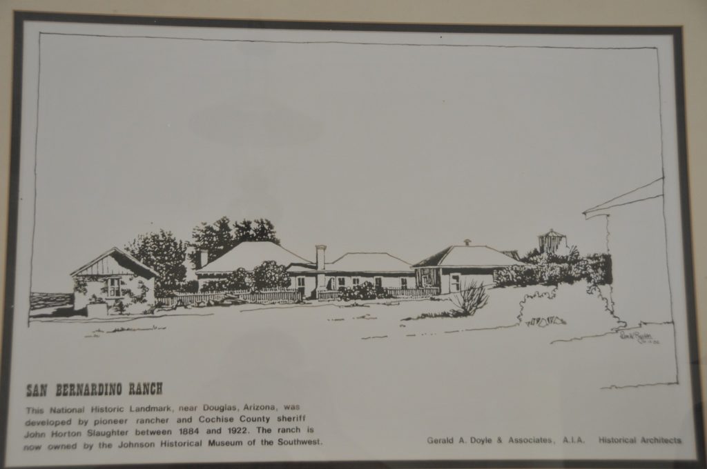 In 1884, John Horton Slaughter, a cowboy and lawman originally from Texas, purchased 65,000 acres (26,000 ha) from Perez’s heirs for approximately $80,000. Two-thirds of his property lay in Mexico, with the remaining third in the Arizona Territory. There are ruins on the property now owned by the United States Fish and Wildlife Service where a Mormon employee of Slaughter’s built a home (called the Mormon House) straddling the U.S.–Mexico border so he could keep a wife in the United States and a wife in Mexico. The home was two rooms, one on each side of the border, with a breezeway connecting them.