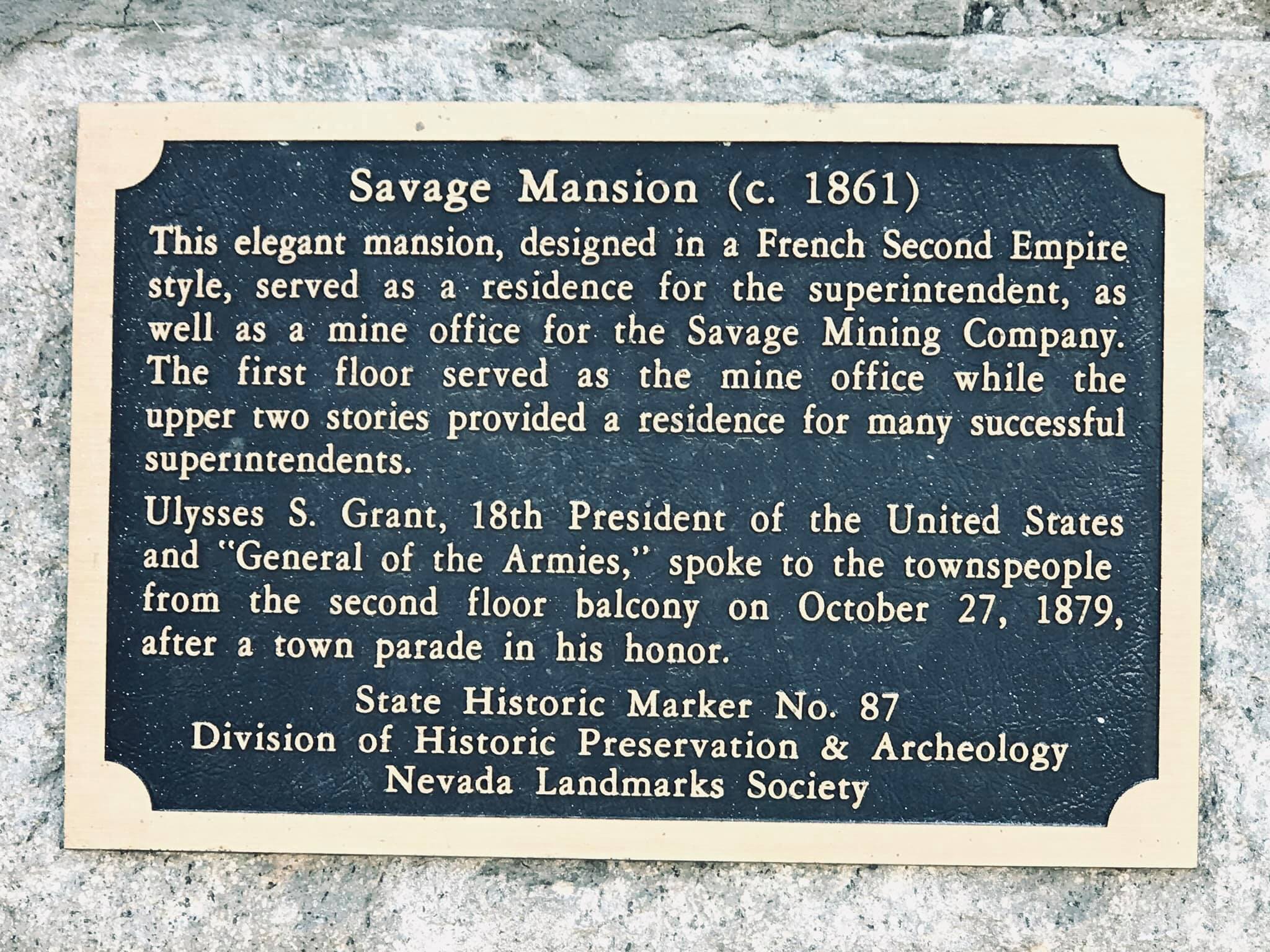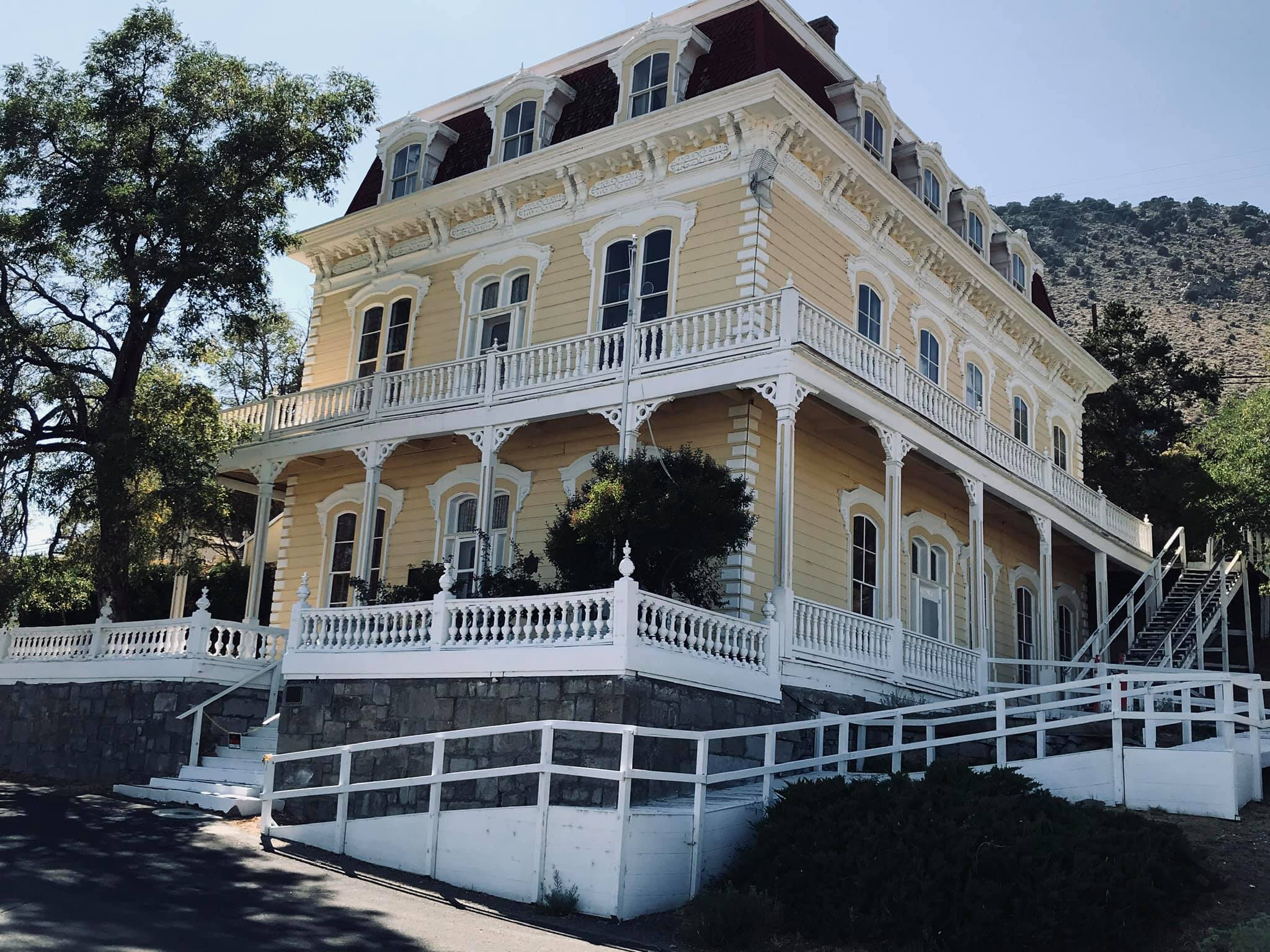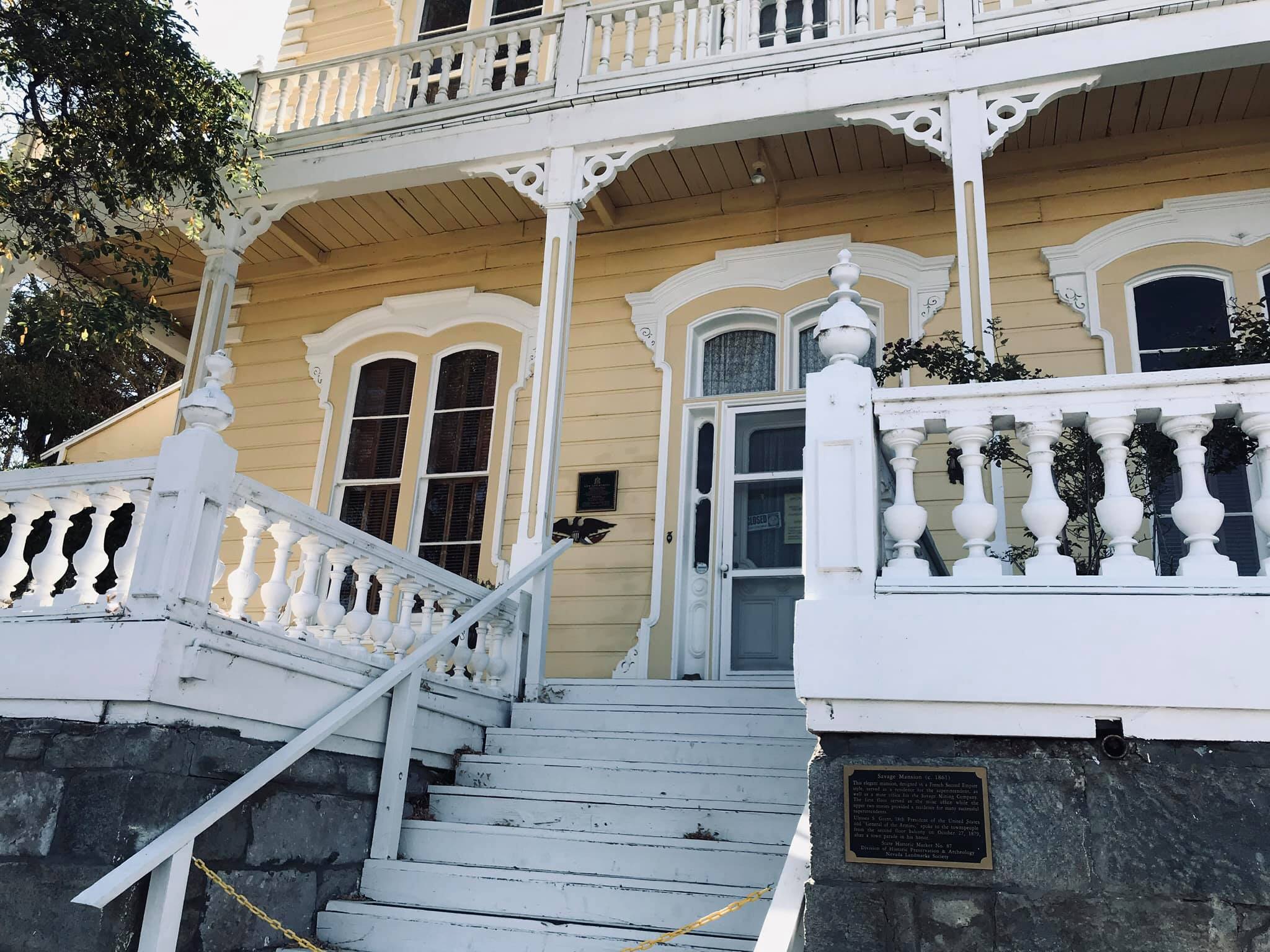 This magnificent 21-room Second Empire style building was constructed by the Savage Mining Company in 1861. The ornate building is an excellent example of the architectural elegance associated with the offices and residences of the mining elite. The top two floors of the building served as the mine superintendent’s residence, while the ground floor was the mine office. The building has been restored with attention to its distinctive architectural features, such as the mansard roof, dormer windows and delicate gingerbread trim. The interior boasts 14-foot-high ceilings, a seven-foot copper bathtub, a Lincrista frieze in the main hallway and early Victorian furnishings. Ulysses S. Grant is said to have stayed in the house in 1879 and addressed crowds in a speech from the porch. During this time, a Mrs. Monoghan, whose husband had been killed in one of the mines, The term “mansion” has been liberally applied in the Comstock to include any large and vaguely residential building. This has been done for promotional purposes and is far from being an accurate characterization. Even the most elaborate dwellings in Virginia City would be considered no more than ordinary houses in any urban setting. In the case of the Savage, Gould & Curry and Chollar properties, all referred to as mansions, the term is a complete misnomer, having been applied to buildings that served primarily as offices for major mining companies.