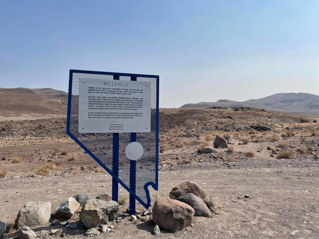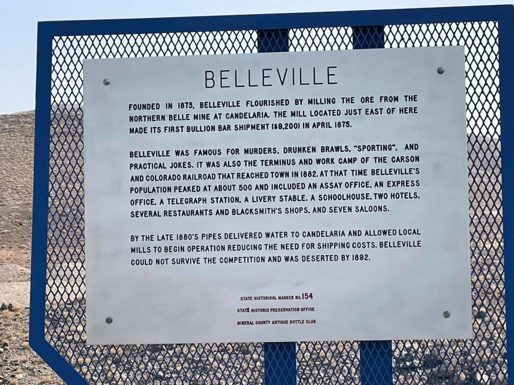 Belleville was founded in 1873 or 1874 and its primary industry was the mill processing ore from the Northern Belle Mine at Candelaria. Its first bullion bar shipment of $9,200 was made in April 1875. The town was famed for a “Wild West” atmosphere; murders, drunken brawls, and “sporting” practical jokes were commonplace. When the Carson and Colorado Railroad reached the town in 1882 its population was 500, and the town was served by a doctor, assay office, express office, telegraph station, livery stable, school, two hotels, restaurants, and blacksmith shops as well as by seven saloons.