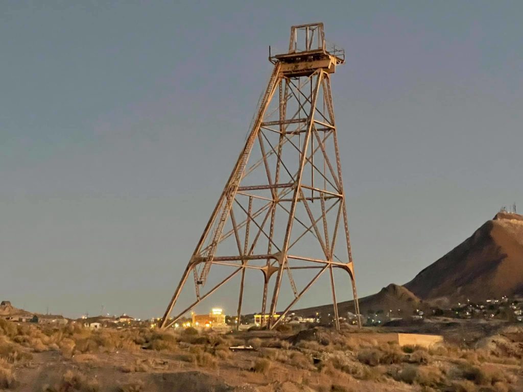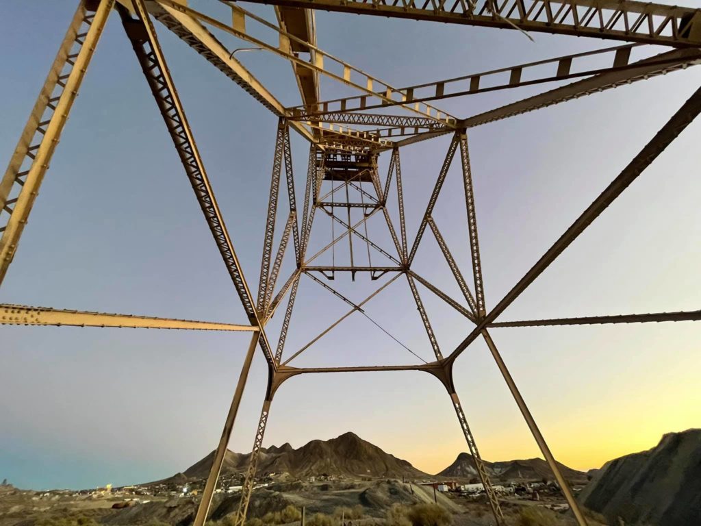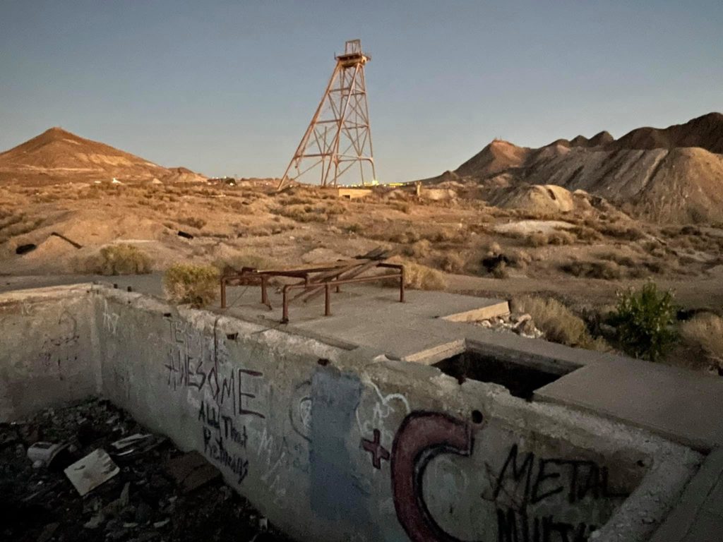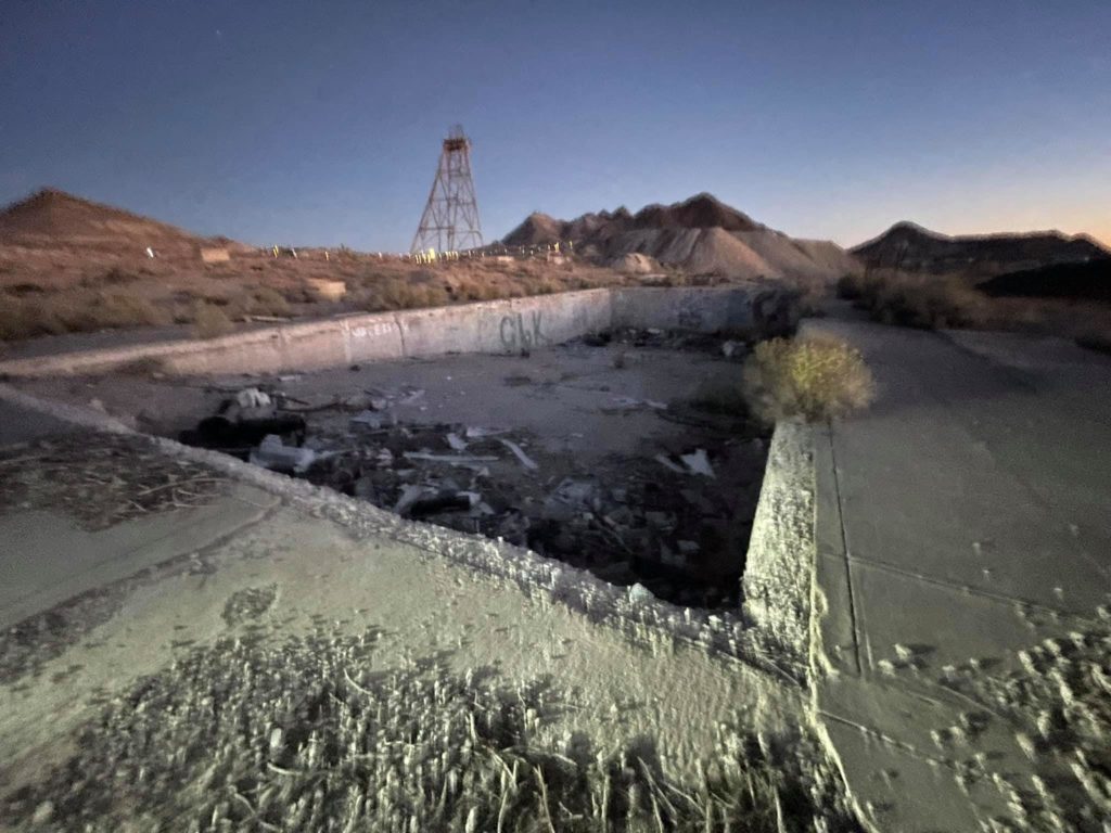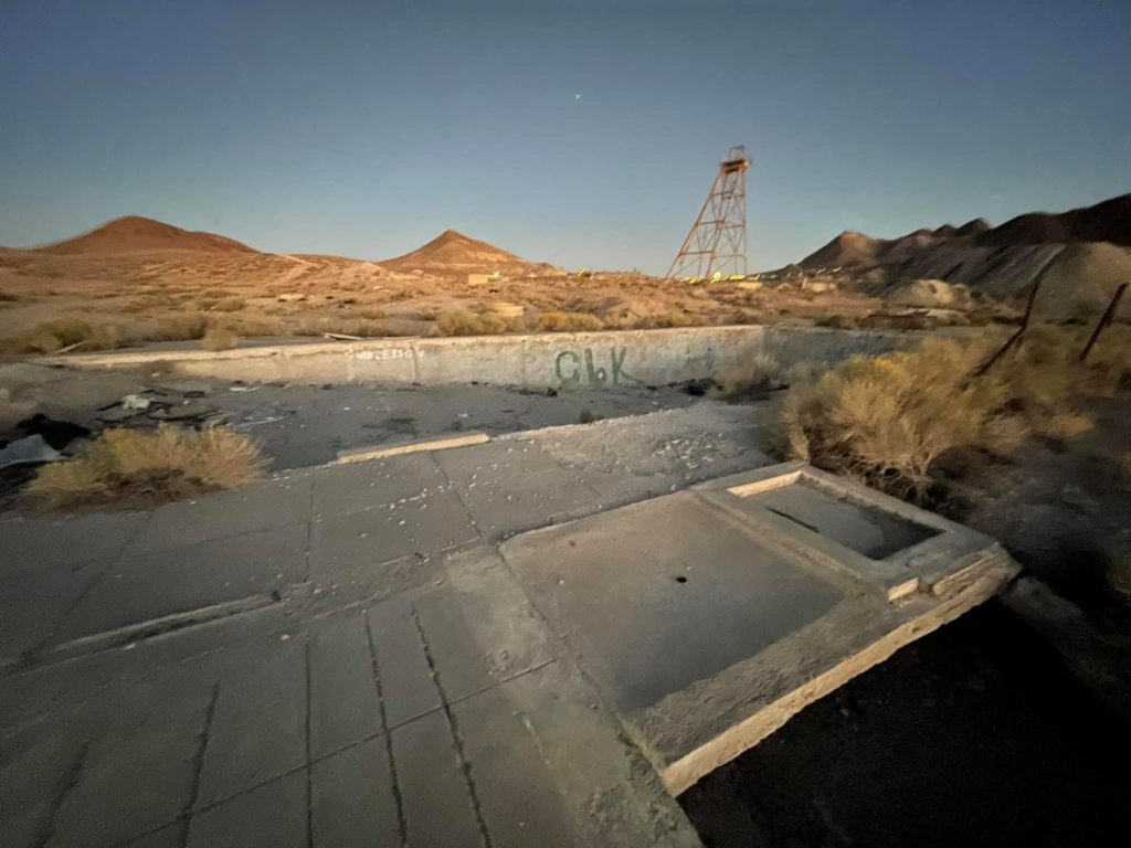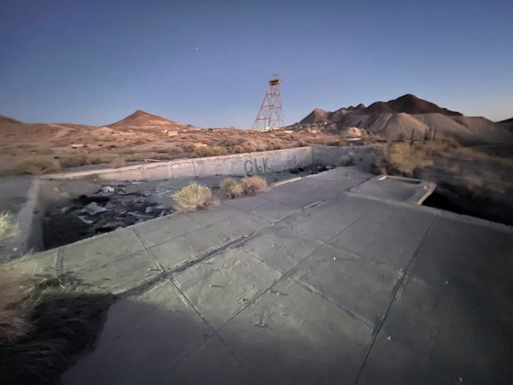 Tonopah Extention Mining Company. This is one of the deepest of the many silver mines in Tonopah. The headframe is the tallest remaining in Tonopah. The hot water from the 2375’ deep shaft fed the community pool provided by the company according to Nevada Expeditions Austen Metz until the mine closed in the 1950’s. The pool has a 10’ deep end as there were large diving boards.