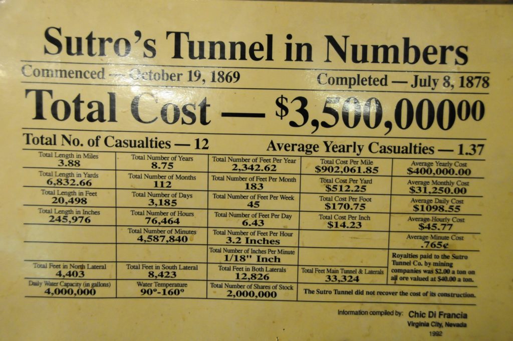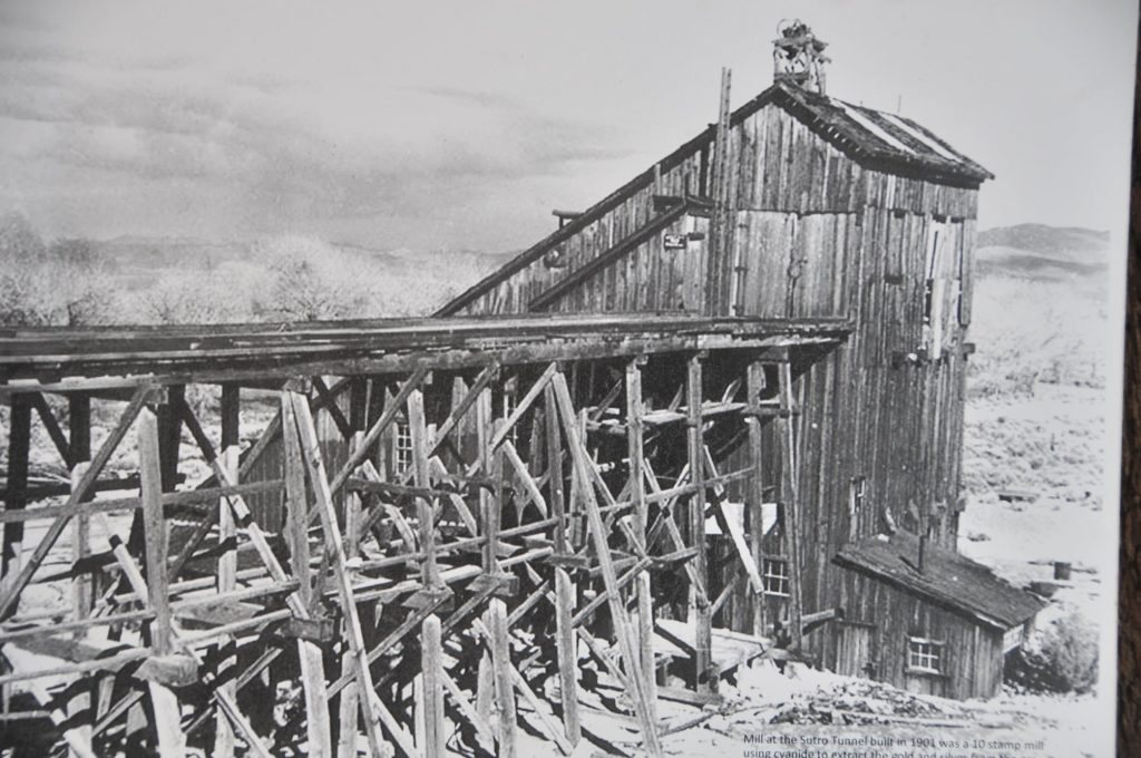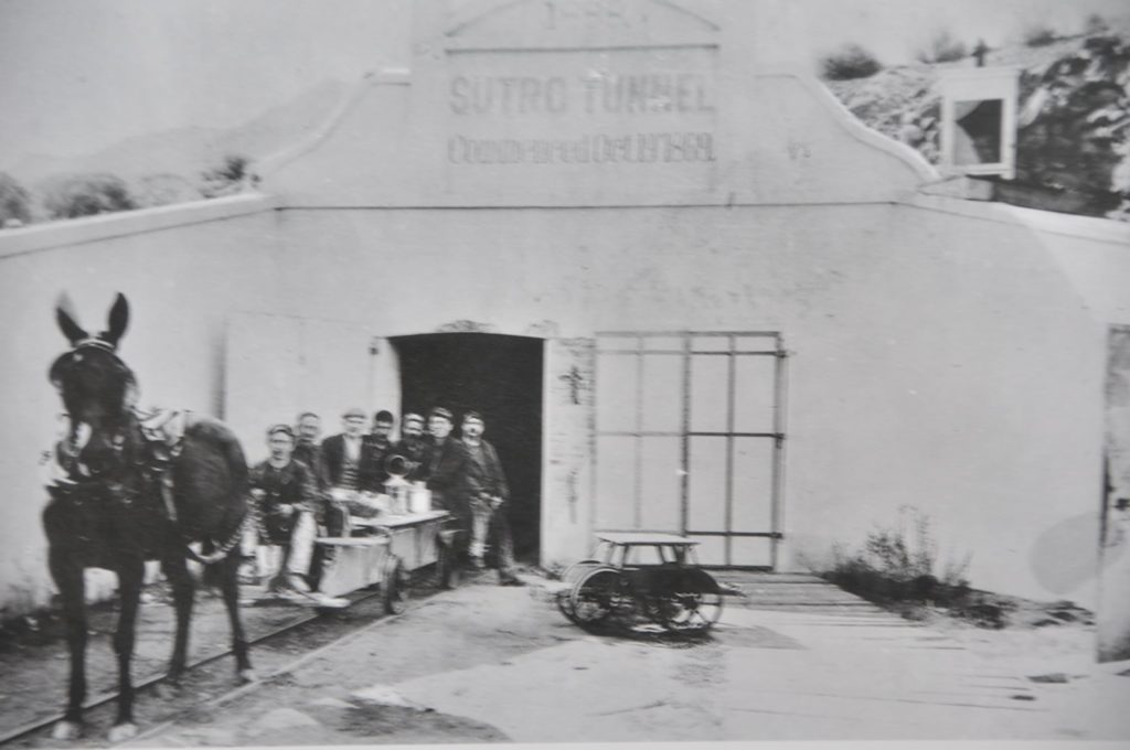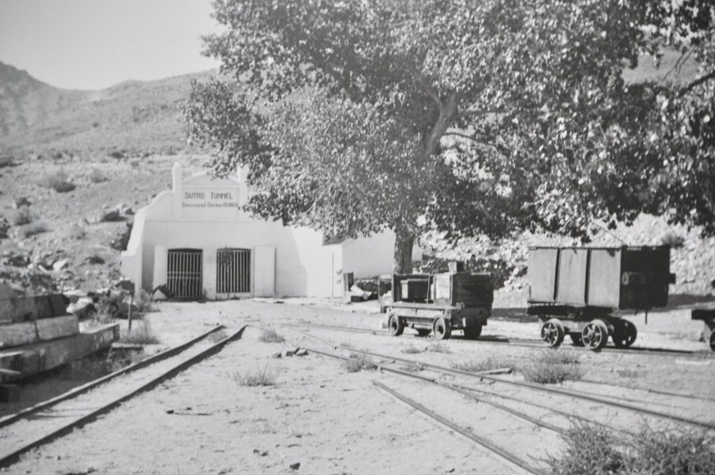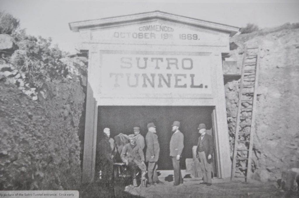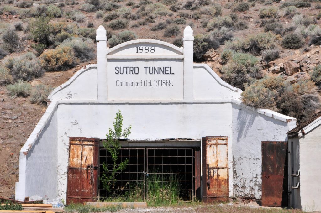 On October 19, 1869 Adolph Sutro raised enough money through stock sales to start a 9 year project to dig a 20,498 foot long tunnel from the hills east of Dayton to intersect the deep silver mines under Virginia City to drain, ventilate and provide an emergency exit. But a bigger reason was to provide both easier and cheaper alternate ore haulage for the mines. Sutro even laid out an entire town plat anticipating relocating much of Virginia City’s commerce and population. On September 1, 1878 miners broke through the 1640 foot deep level of the Savage mine under the center of Virginia City. They were only 18” off center. They then dug a 4,403’ lateral to the North and an 8,423’ lateral to the south that terminated at the Alta shaft in Gold Hill. The tunnel continues to this day to collect fees to drain the mines of the Comstock.