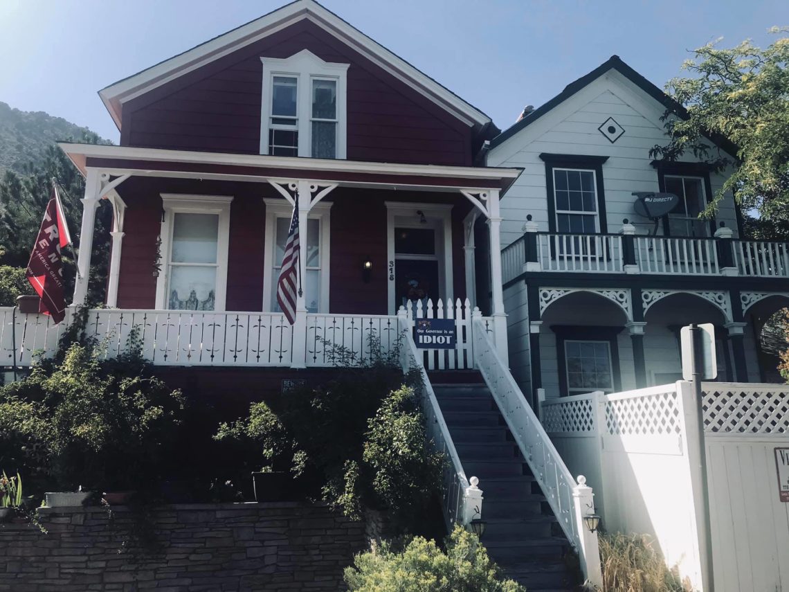 As the story goes, there were two miners in Virginia City, Nevada who were sworn enemies. After one miner bought a plot of land and built a small white house with lots of windows so he could enjoy the sun and warm breezes, the other miner decided to exact his revenge by buying the property next door, and moving his already-built red cottage just inches from the other miner’s home. Across the street from Anabelle’s House. Photo copyrighted Steve Knight photo